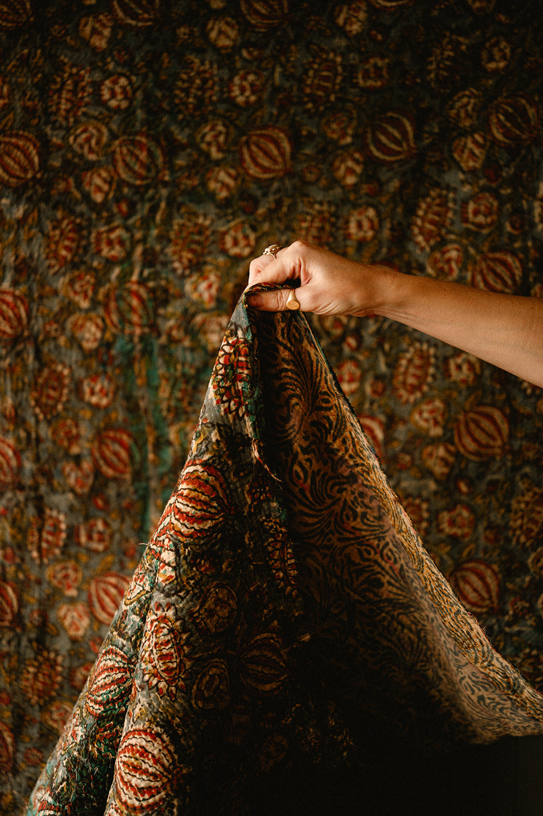 Add a touch of timeless elegance to your home with our vintage Bagru Kantha quilts, handmade in India. These stunning quilts are crafted from layers of recycled cotton saris, featuring intricate kantha embroidery and traditional Bagru block prints. Each quilt is reversible, offering two unique looks in one, with vibrant patterns on one side and subtle designs or plain textures on the other.