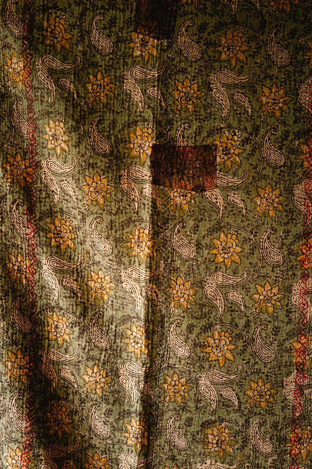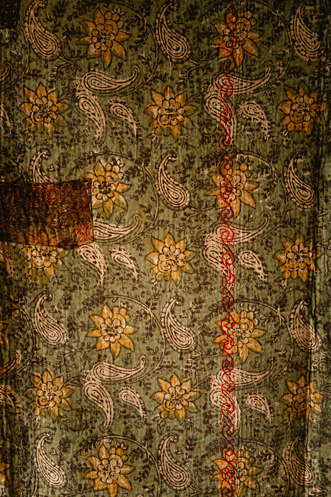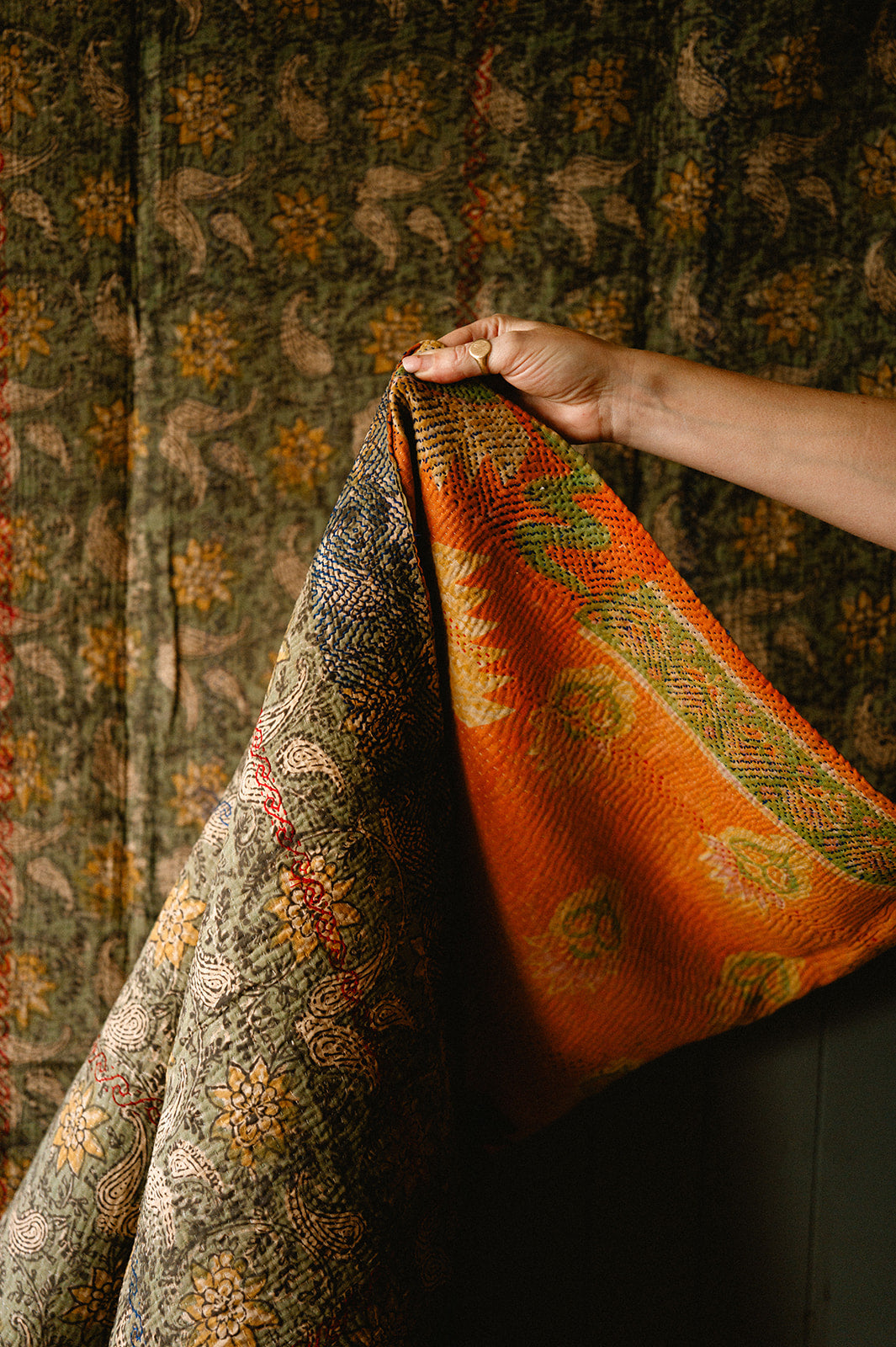 Add a touch of timeless elegance to your home with our vintage Bagru Kantha quilts, handmade in India. These stunning quilts are crafted from layers of recycled cotton saris, featuring intricate kantha embroidery and traditional Bagru block prints. Each quilt is reversible, offering two unique looks in one, with vibrant patterns on one side and subtle designs or plain textures on the other.