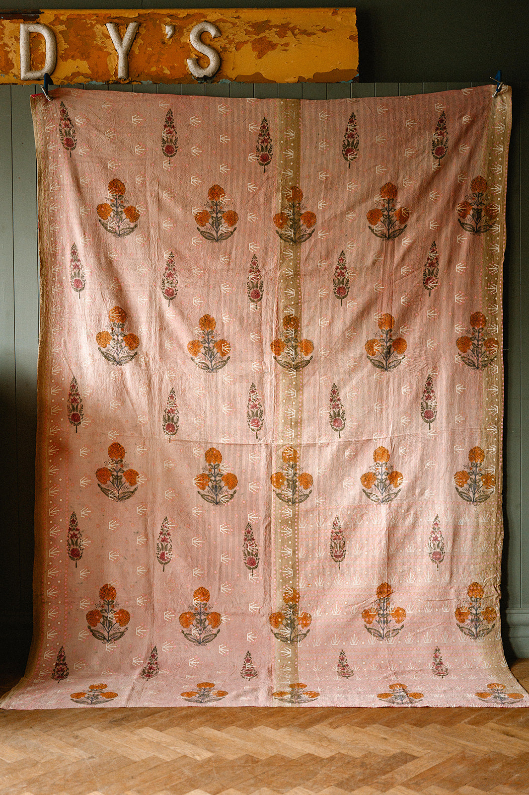 This vintage Indian hand-printed block throw is a beautiful piece of traditional craftsmanship, handmade in India using age-old block printing techniques. Each motif is stamped by hand with carved wooden blocks, creating unique patterns that carry the charm of true artisan work. Finished with delicate running stitch detailing, the fabric has a soft, textured feel that adds warmth and character. Made from natural cotton, it is light yet durable, making it easy to use in many ways — drape it across your sofa or bed as a throw, hang it as a curtain, or style it as an eye-catching table cloth. Its gentle vintage tones and handmade finish bring a touch of soulful heritage to any space.