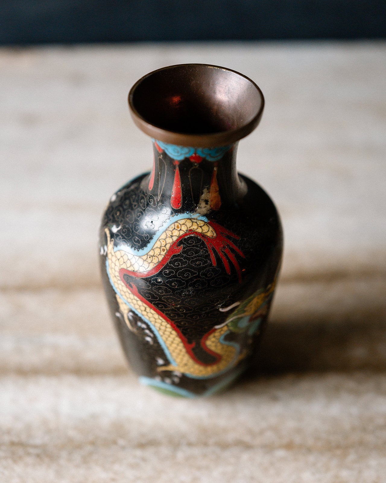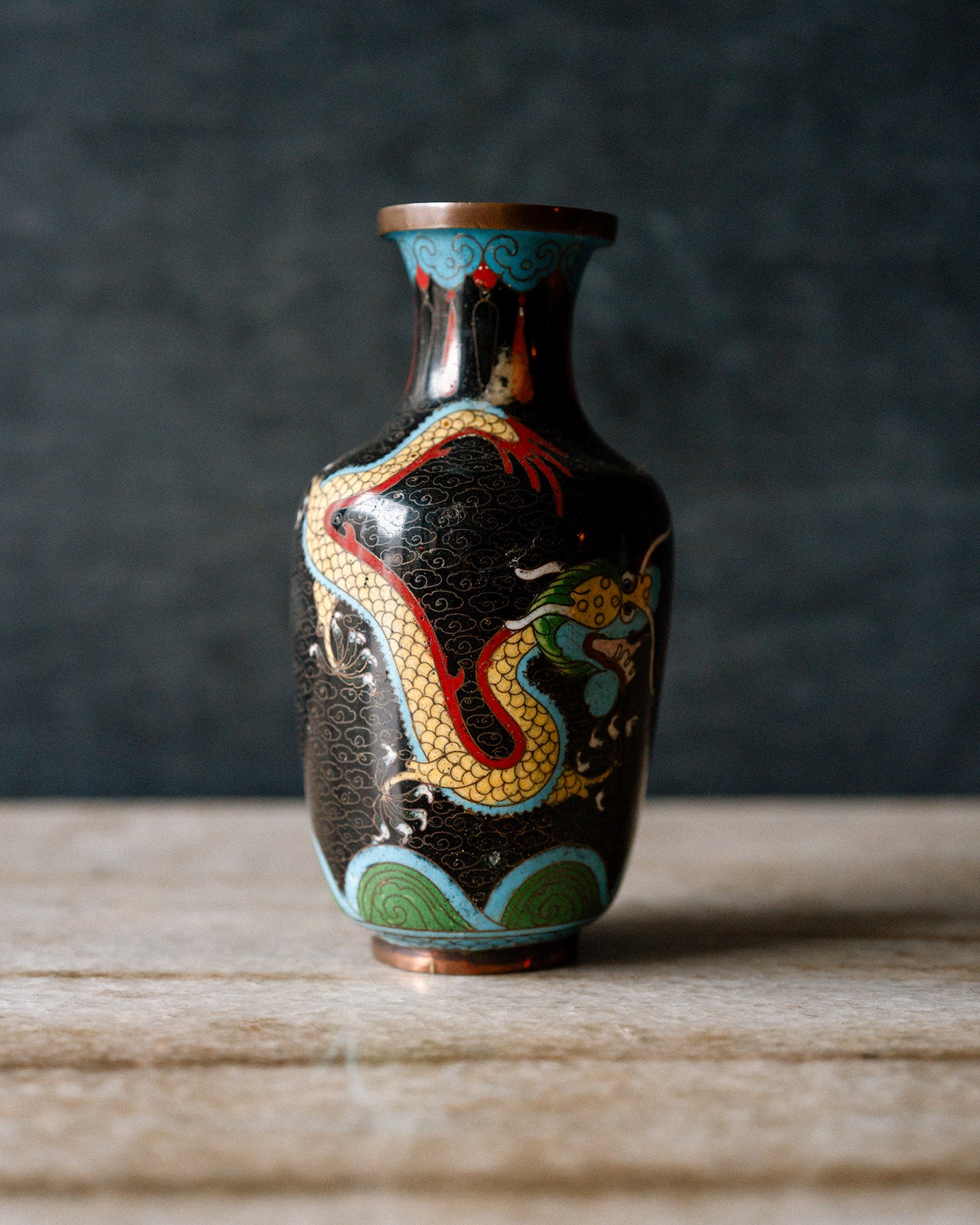 Striking Chinese cloisonné vase decorated with a bold dragon motif. Made using the traditional cloisonné technique, where fine metal wires create the design and are filled with rich enamel. The dragon, in yellow and red tones, stands out beautifully against a deep black ground. Enamel over a copper/brass base, giving it good weight and presence. A classic decorative piece with strong colour and detail.