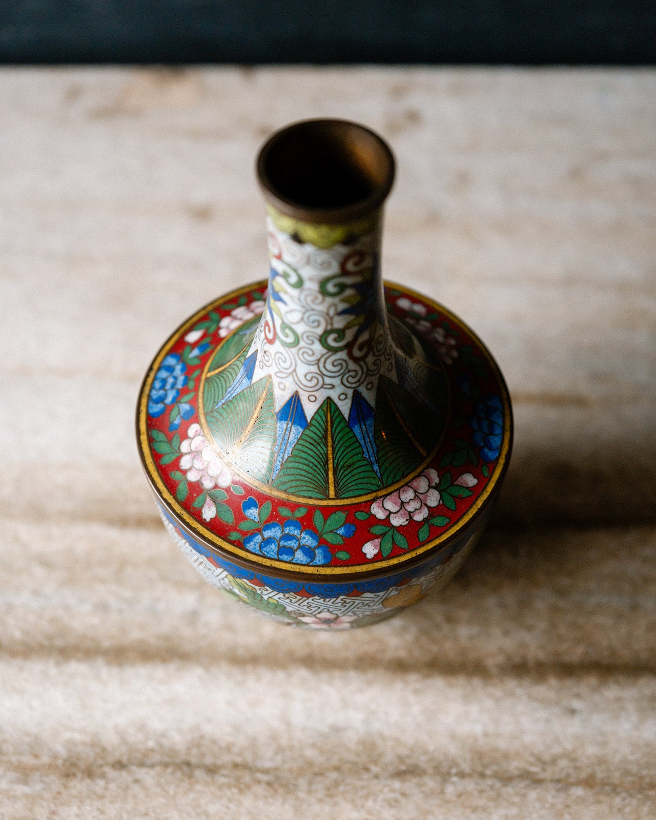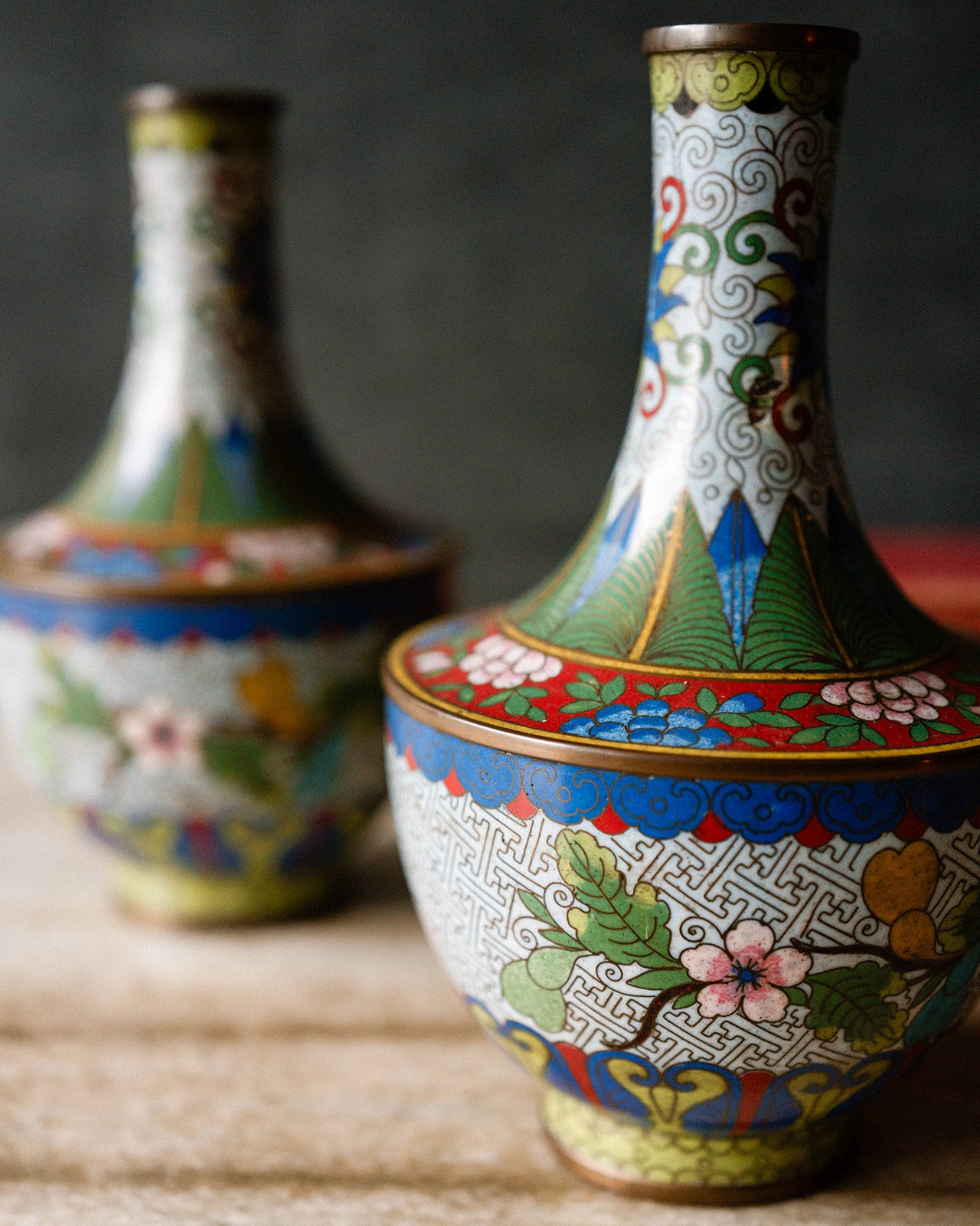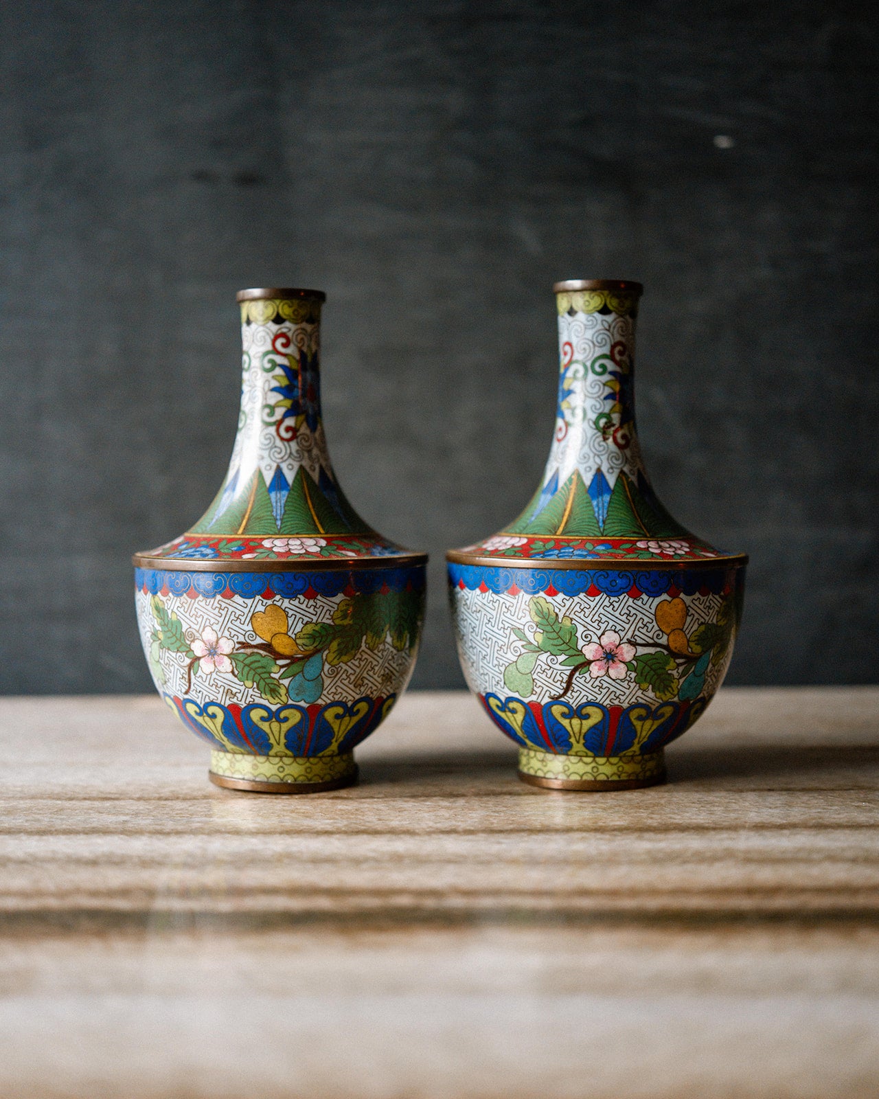A lovely pair of Chinese cloisonné enamel vases, crafted with the classic baluster form and flared feet and necks. Each one is richly detailed with floral and cloud motifs, made using the traditional cloisonné method that’s been perfected since the Ming and Qing eras. Colourful, decorative, and highly collectible—perfect statement pieces for any home or collection.