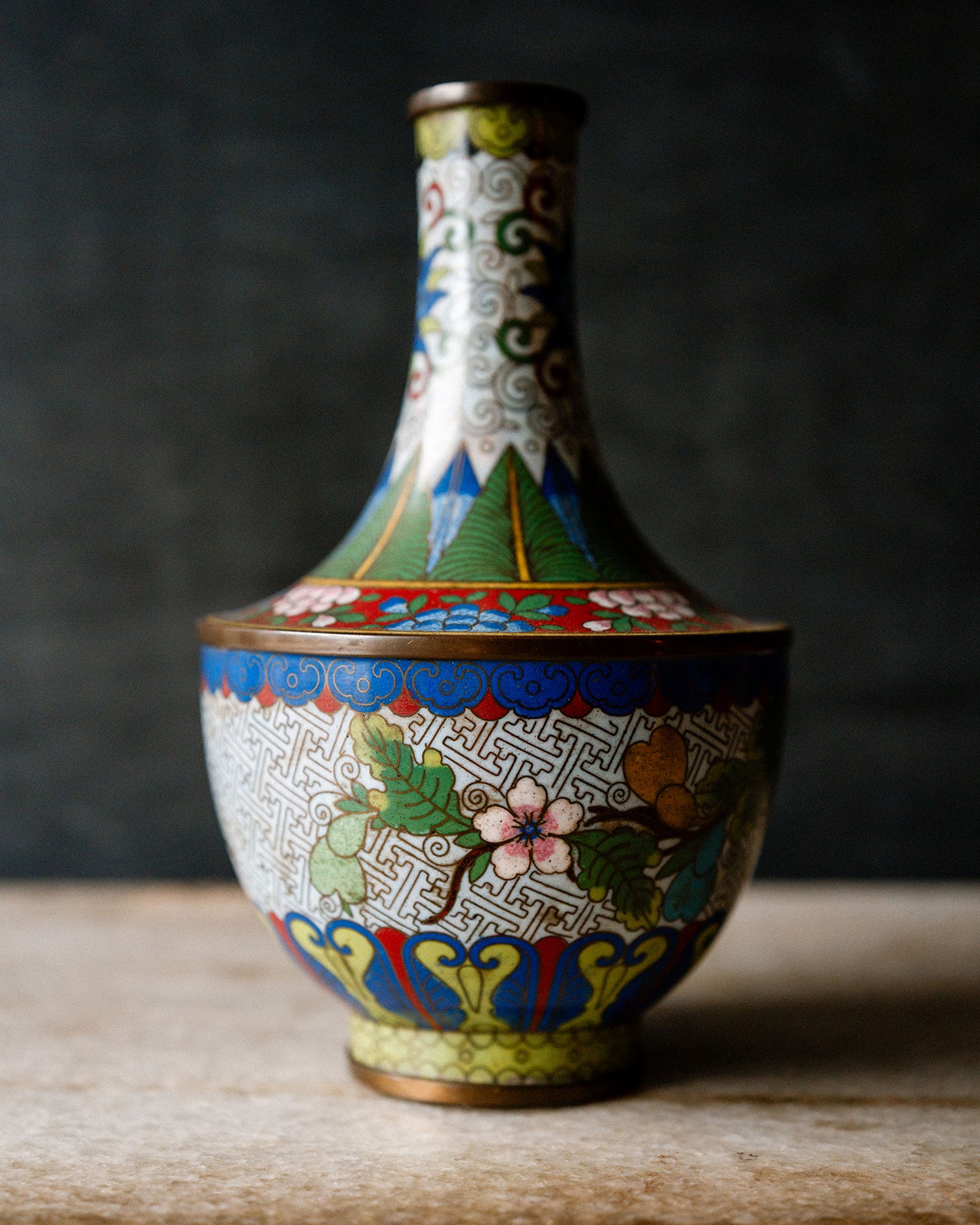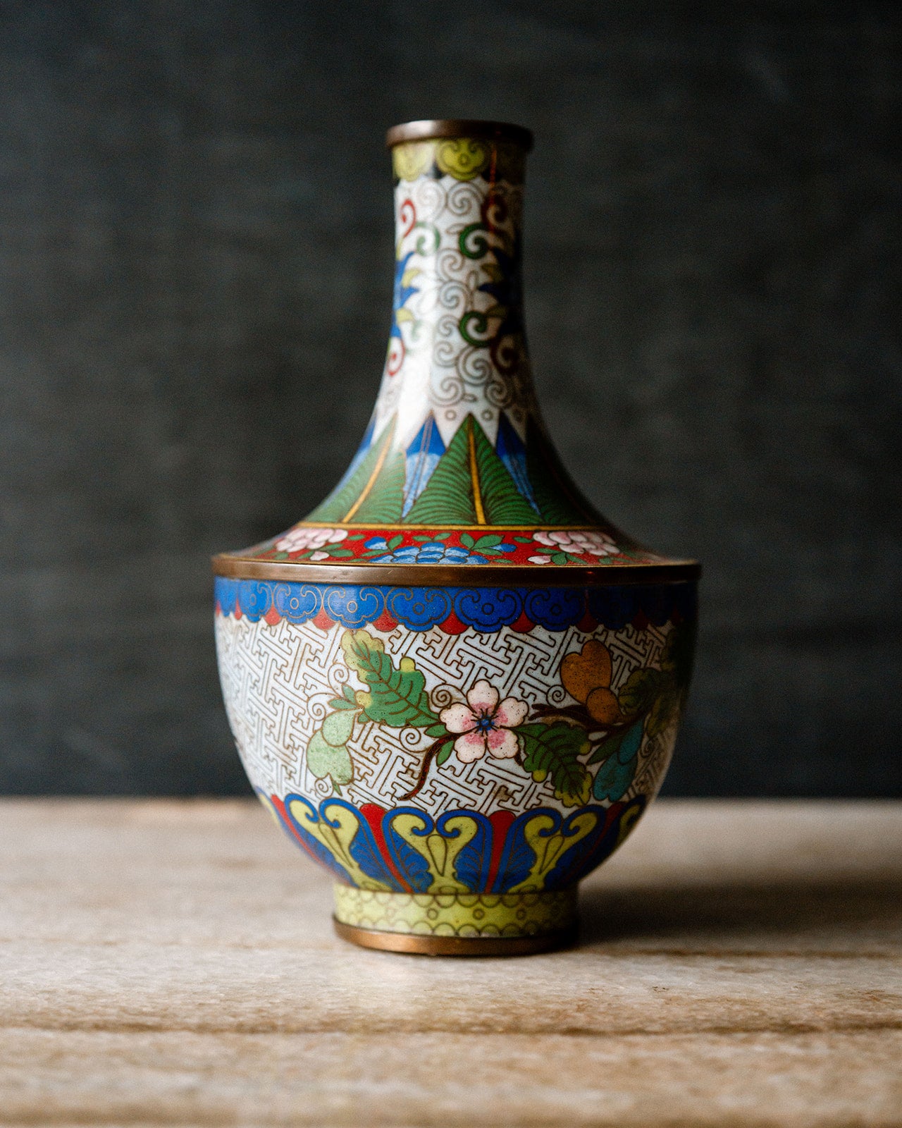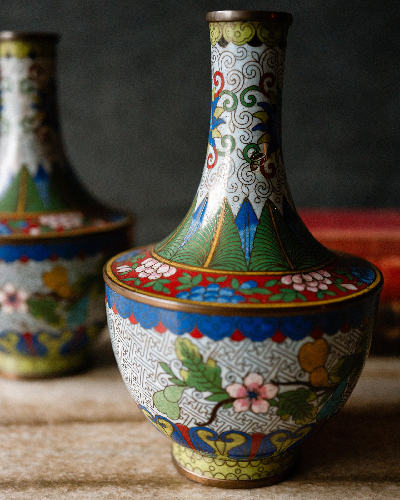 A lovely pair of Chinese cloisonné enamel vases, crafted with the classic baluster form and flared feet and necks. Each one is richly detailed with floral and cloud motifs, made using the traditional cloisonné method that’s been perfected since the Ming and Qing eras. Colourful, decorative, and highly collectible—perfect statement pieces for any home or collection.