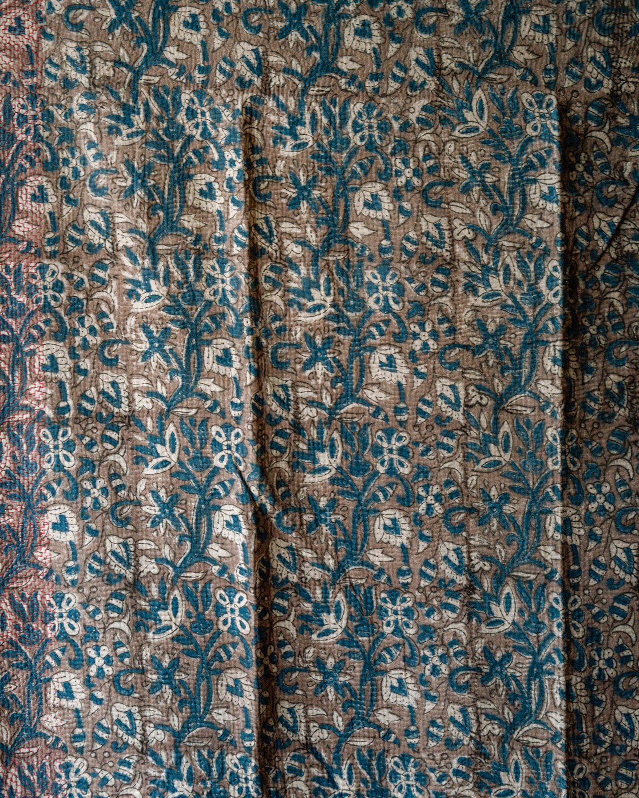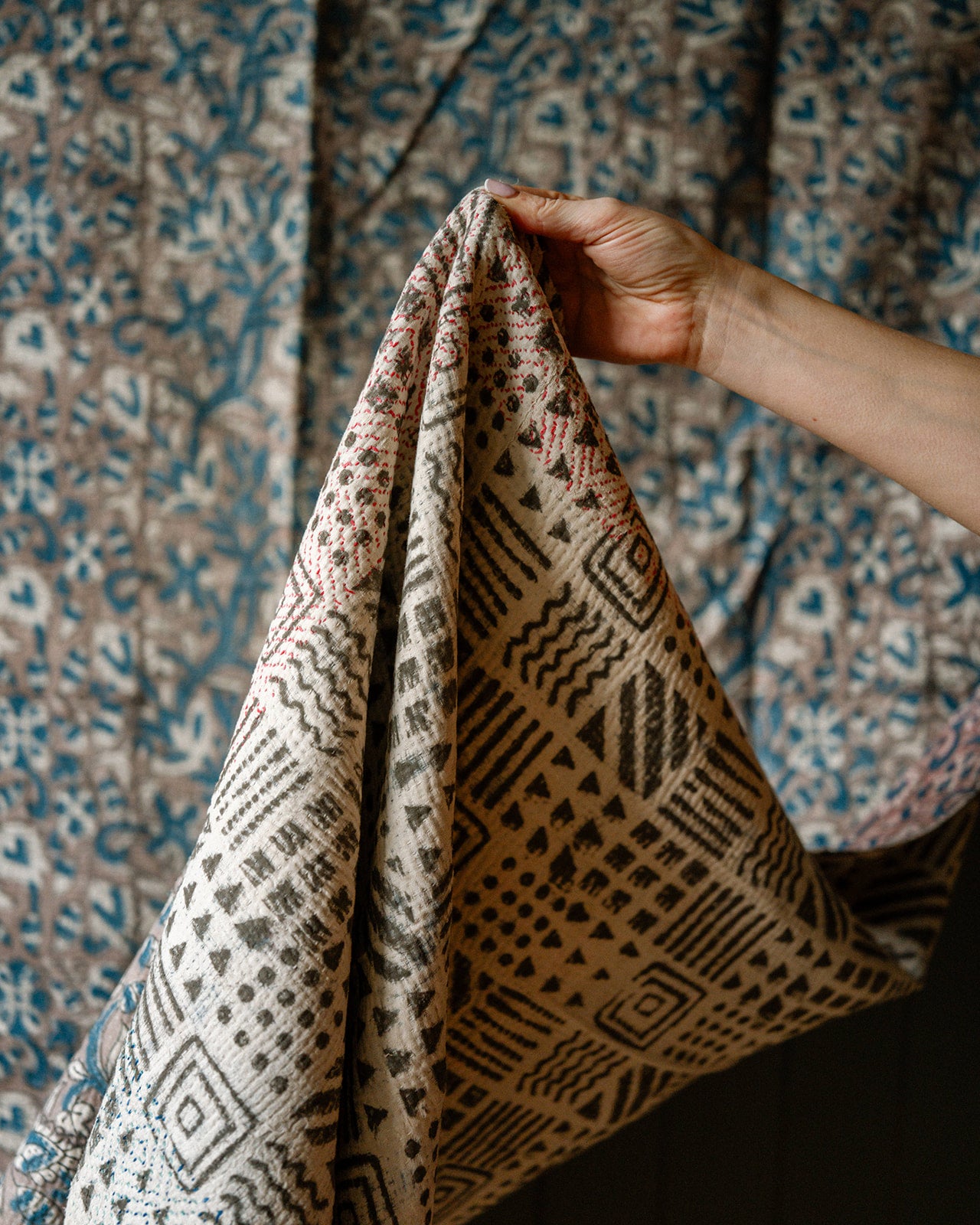 Add a touch of timeless elegance to your home with our vintage Bagru Kantha quilts, handmade in India. These stunning quilts are crafted from layers of recycled cotton saris, featuring intricate kantha embroidery and traditional Bagru block prints. Each quilt is reversible, offering two unique looks in one, with vibrant patterns on one side and subtle designs or plain textures on the other.
