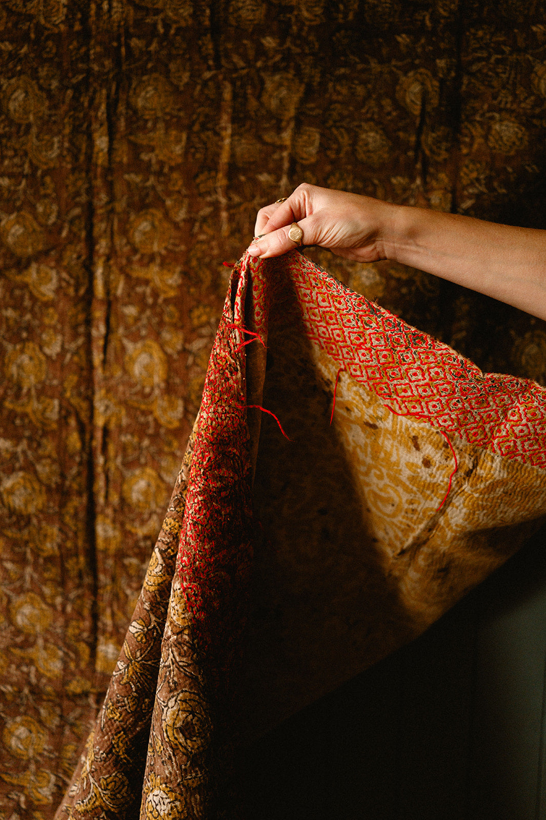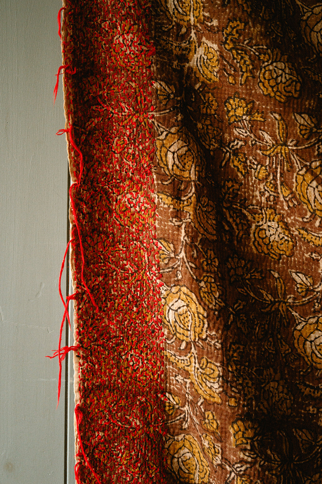 Add a touch of timeless elegance to your home with our vintage Bagru Kantha quilts, handmade in India. These stunning quilts are crafted from layers of recycled cotton saris, featuring intricate kantha embroidery and traditional Bagru block prints. Each quilt is reversible, offering two unique looks in one, with vibrant patterns on one side and subtle designs or plain textures on the other.