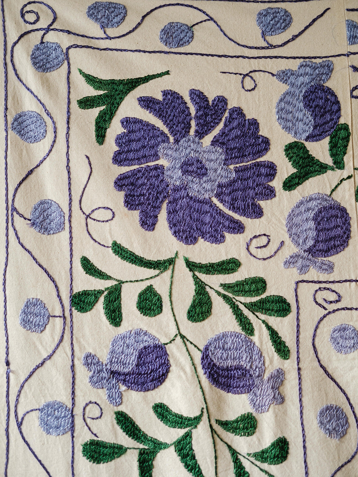 Enhance your living space with the rich cultural heritage of our hand-embroidered Uzbek suzanis. Each piece is meticulously crafted by skilled artisans, showcasing traditional floral and sun motifs in vibrant silk threads on high-quality cotton. The natural dyes, derived from sources like pomegranate and walnut, add depth and authenticity to the colors.