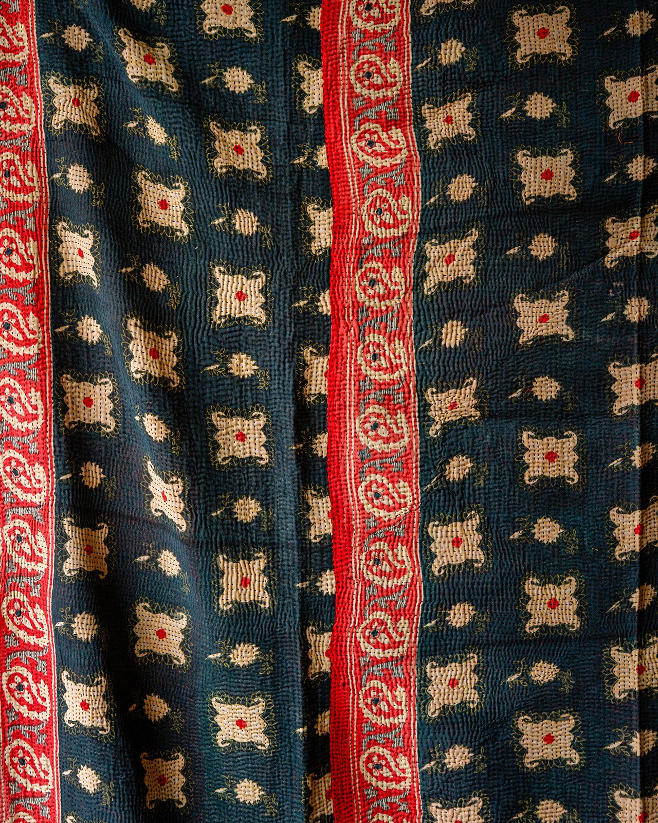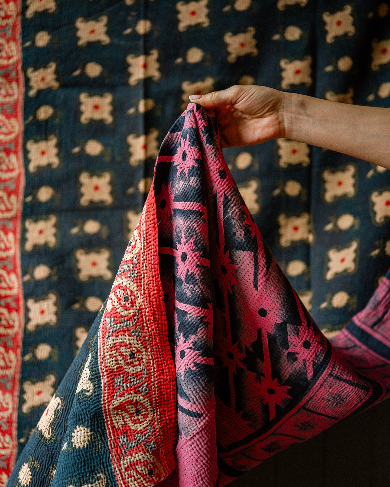 Add a touch of timeless elegance to your home with our vintage Bagru Kantha quilts, handmade in India. These stunning quilts are crafted from layers of recycled cotton saris, featuring intricate kantha embroidery and traditional Bagru block prints. Each quilt is reversible, offering two unique looks in one, with vibrant patterns on one side and subtle designs or plain textures on the other.