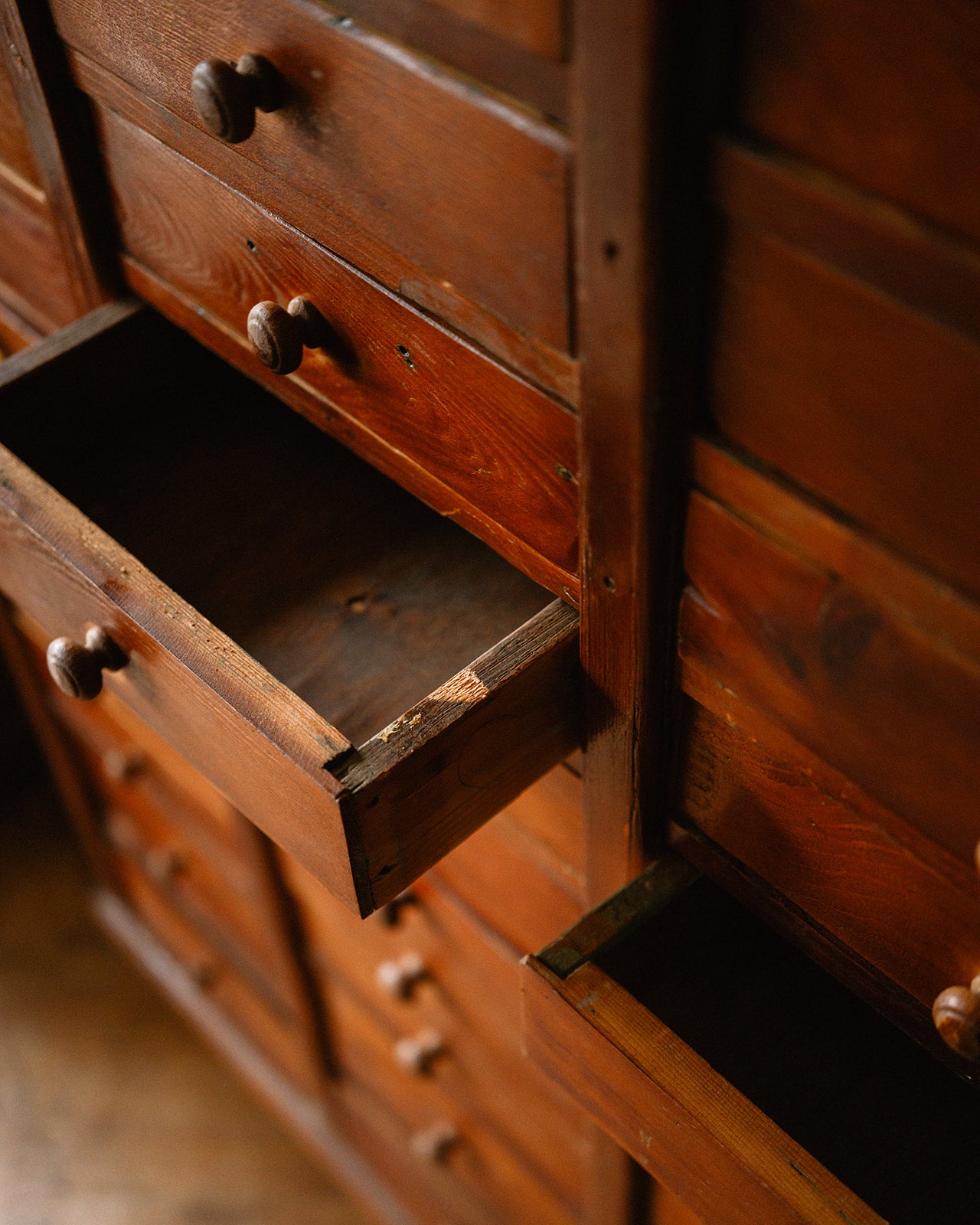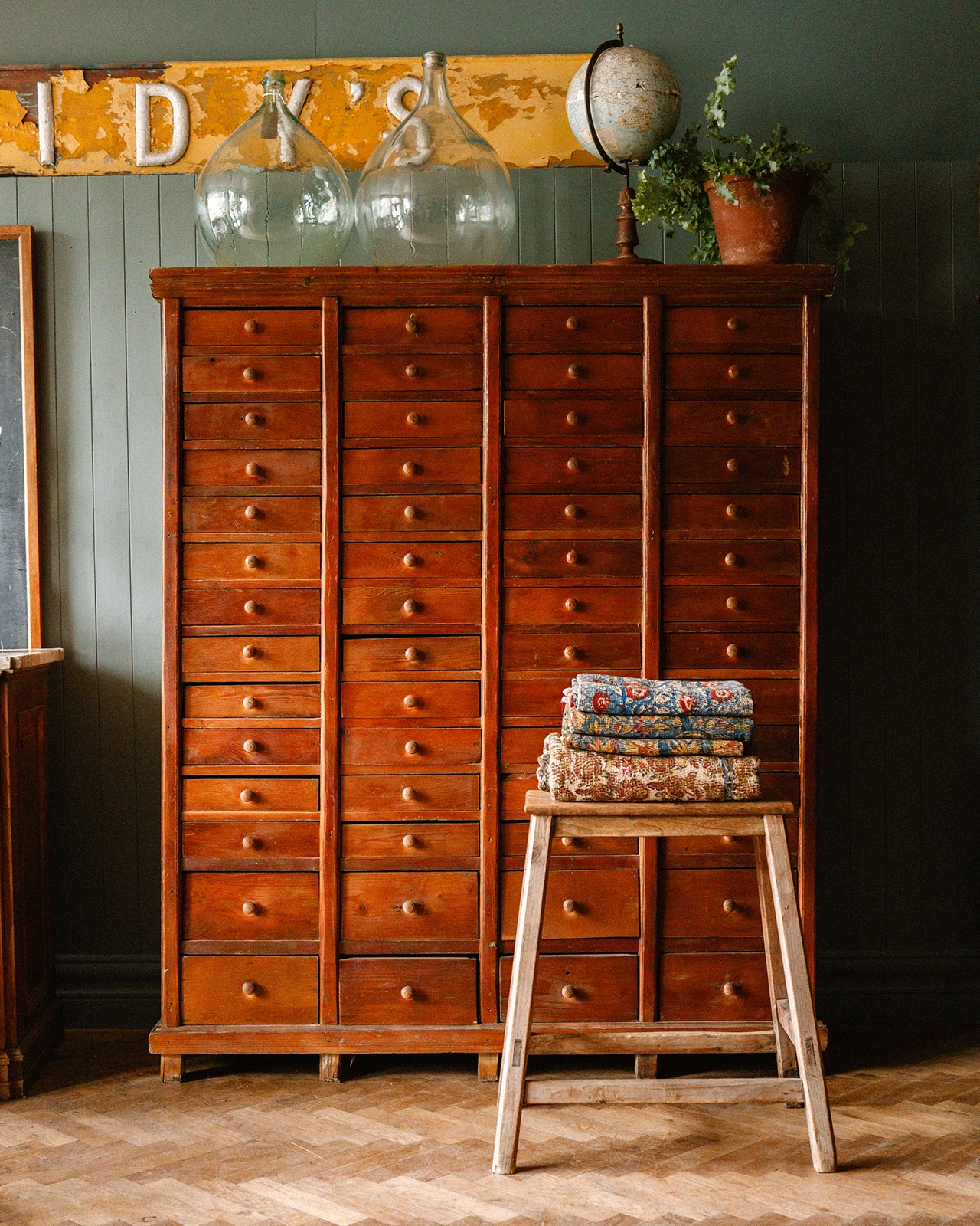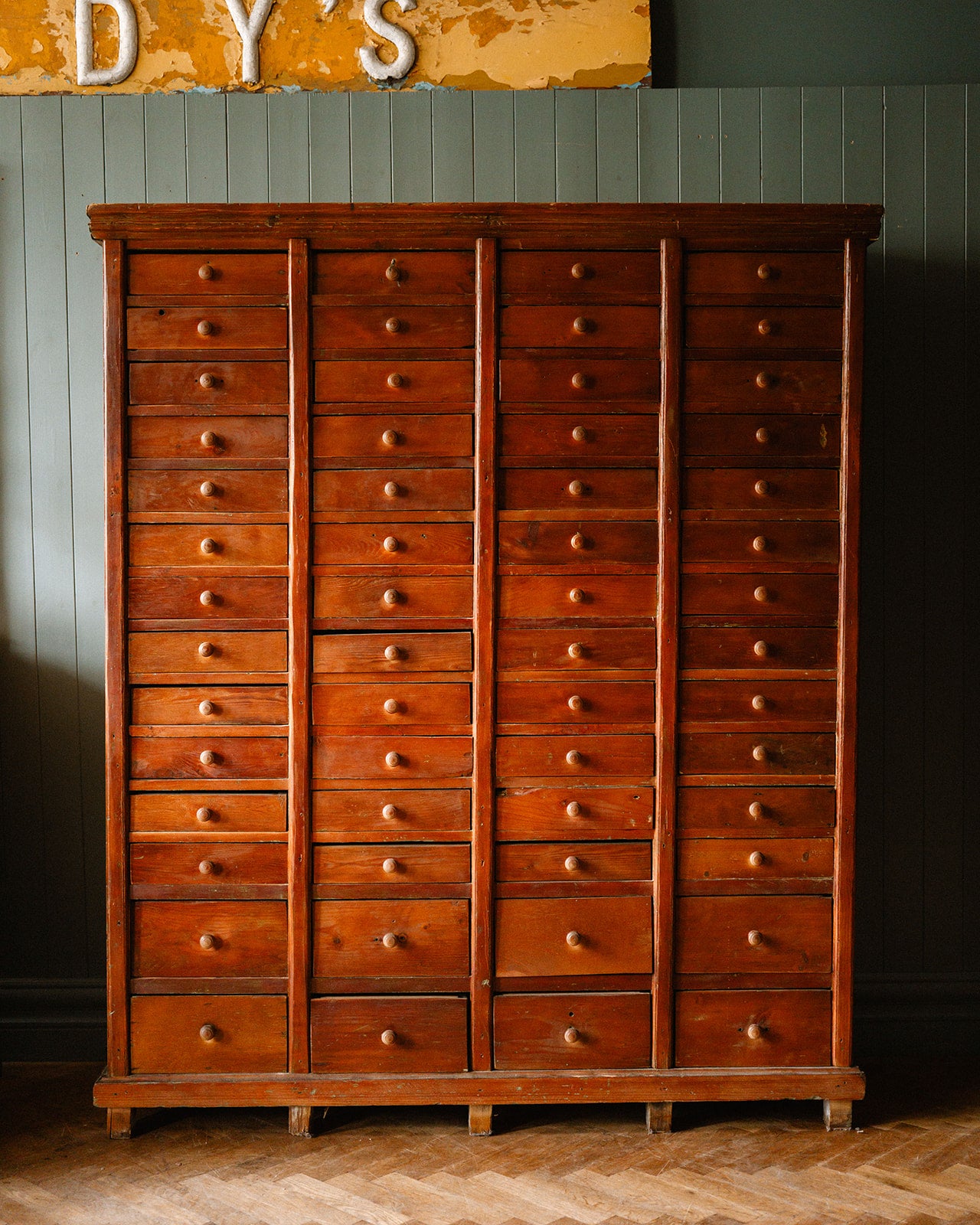 Lovely Vintage bank with great patina and loads of practical storage. Two available! Makes for a brilliant storage piece and works well in a kitchen, studio or shop setting.