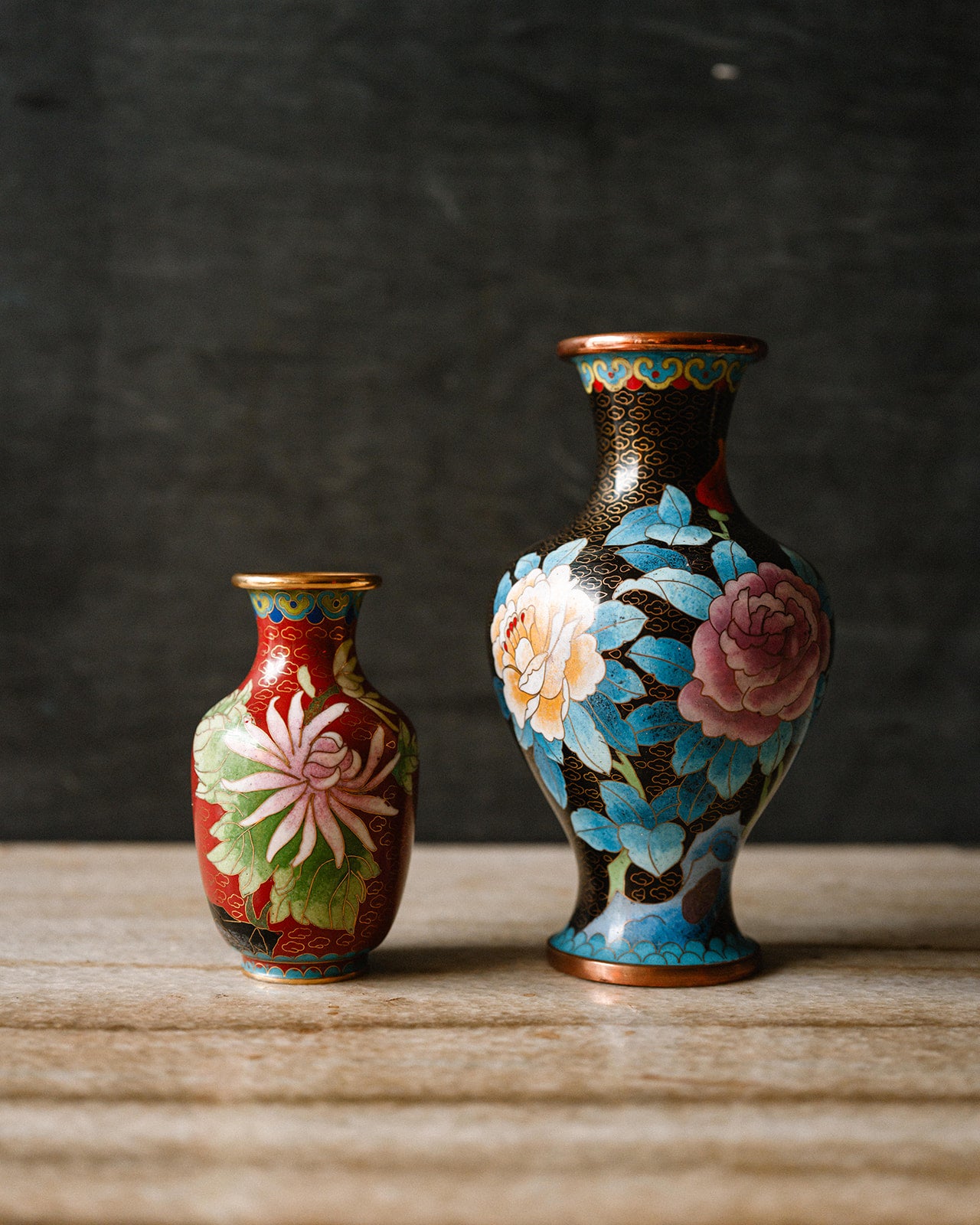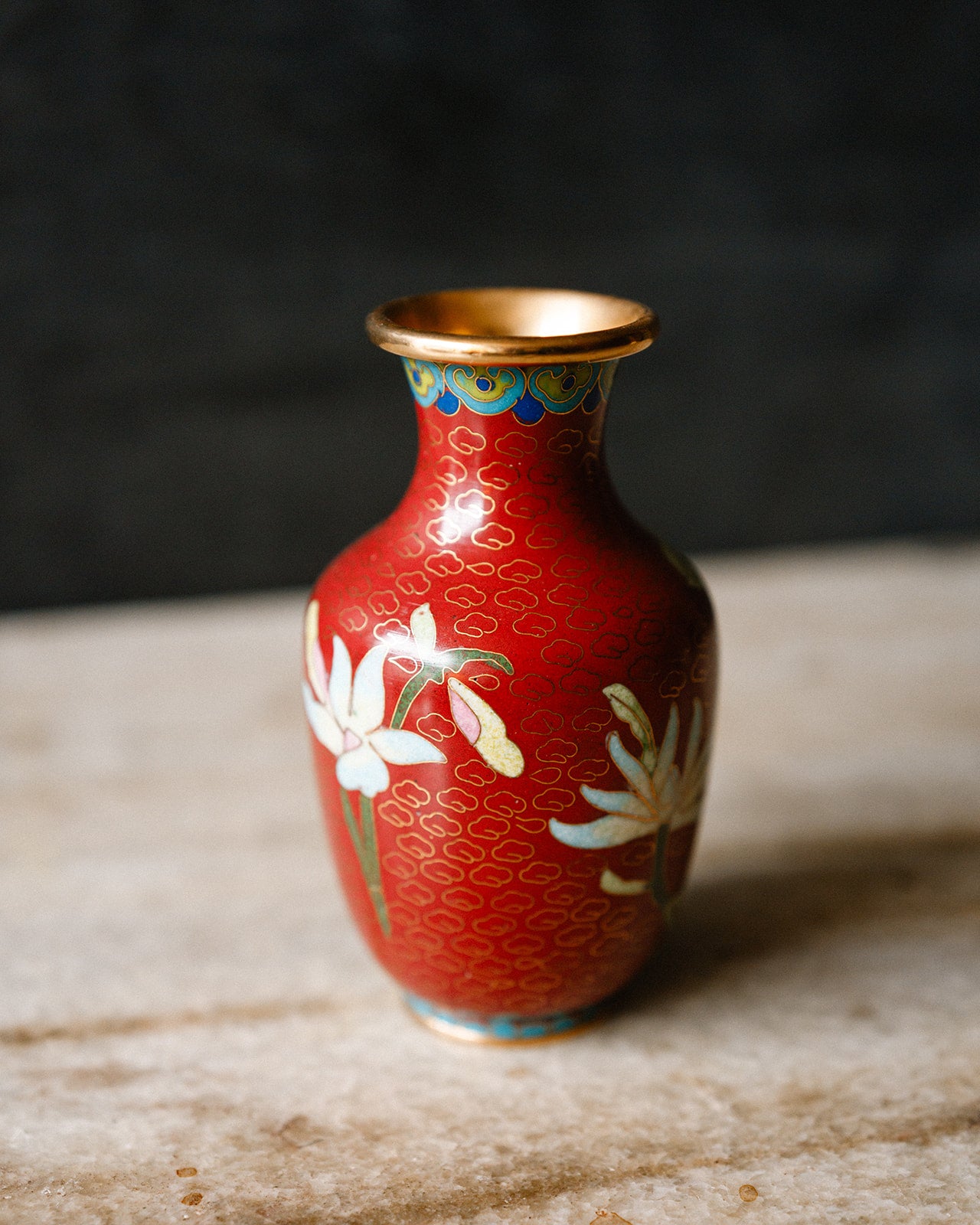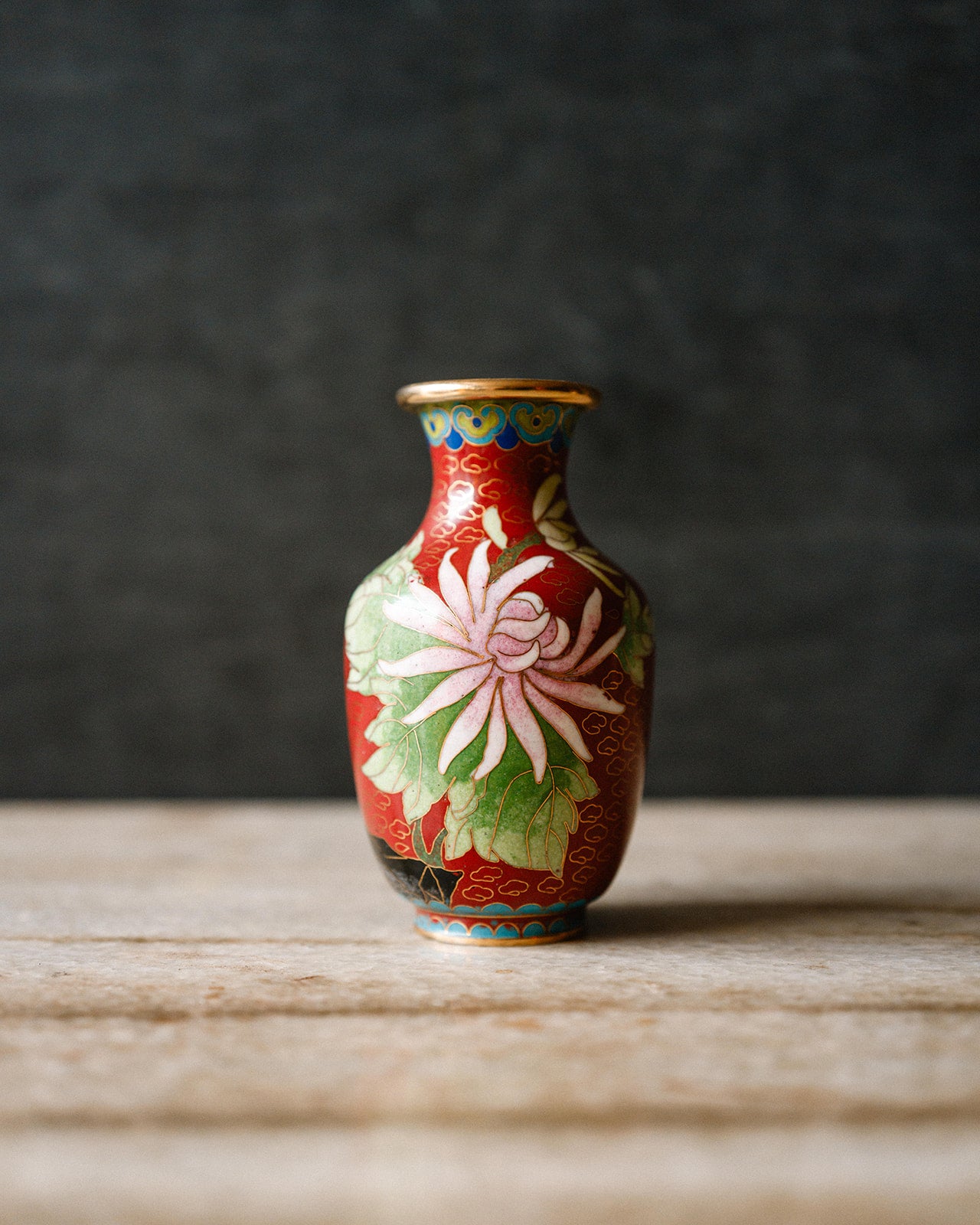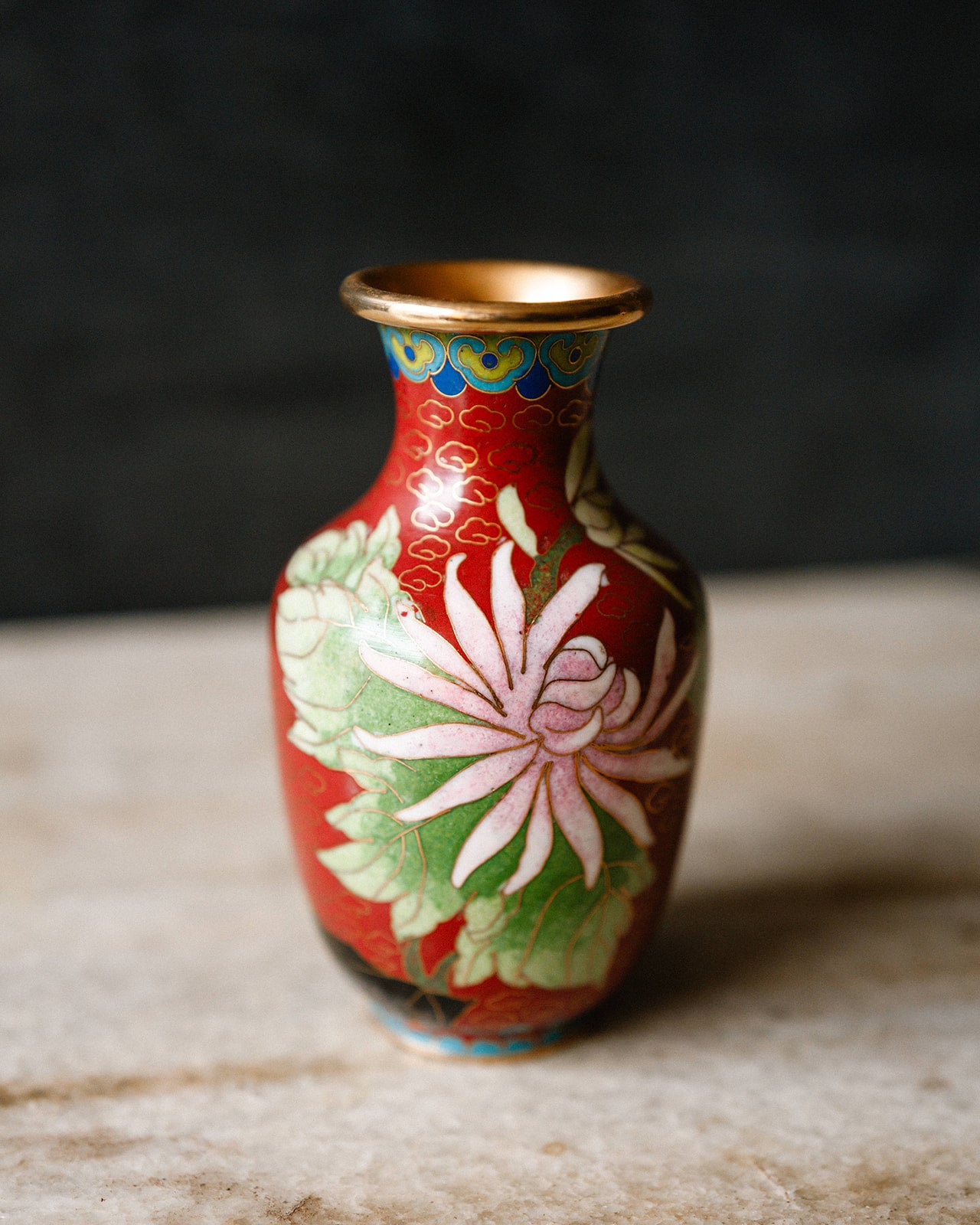A classic Chinese cloisonné enamel vase with rich color and lovely detail. It’s crafted using the traditional cloisonné technique—thin metal wires shaped into a design and filled with enamel before firing. The vase shows a deep burgundy-red background with a large pink and white chrysanthemum and soft green leaves. Finished with brass trim at the top and base, it has a warm, timeless look that fits any space.