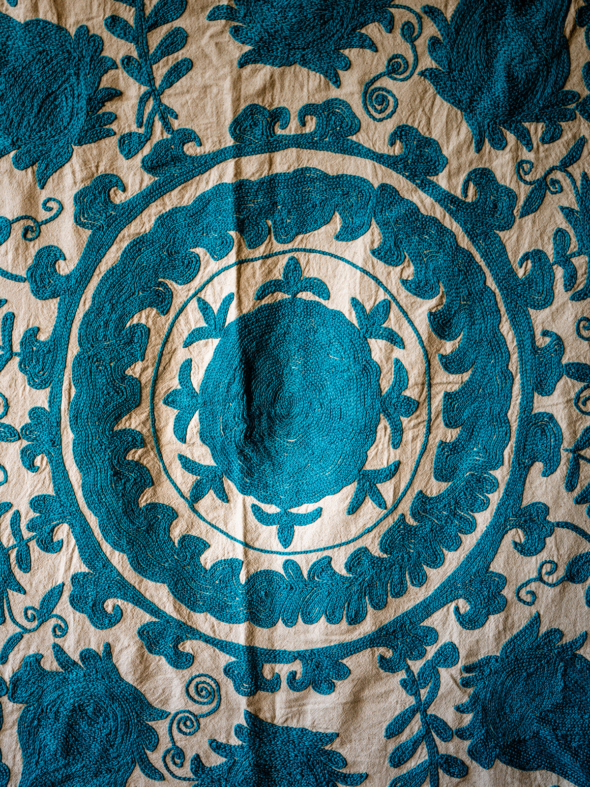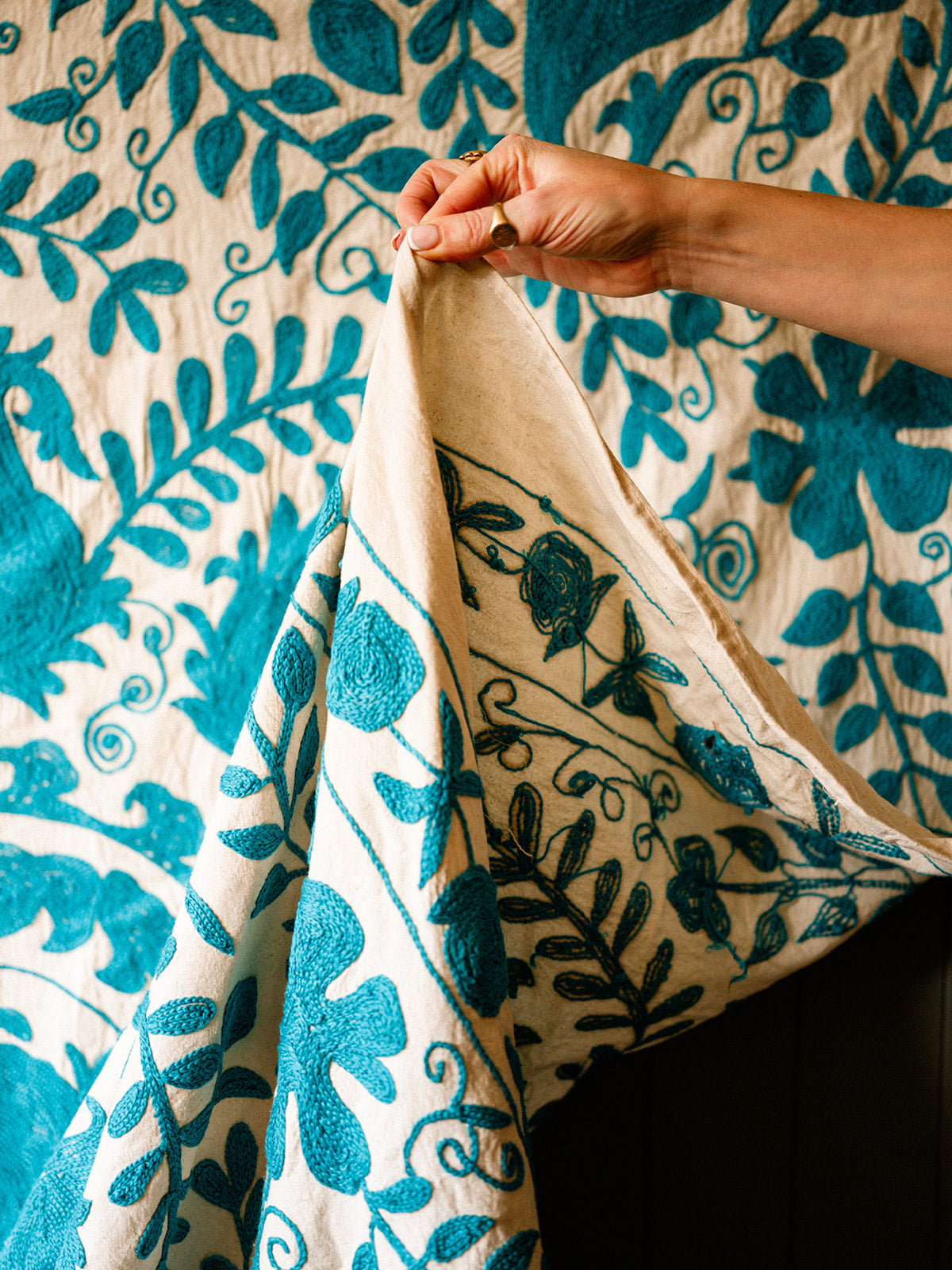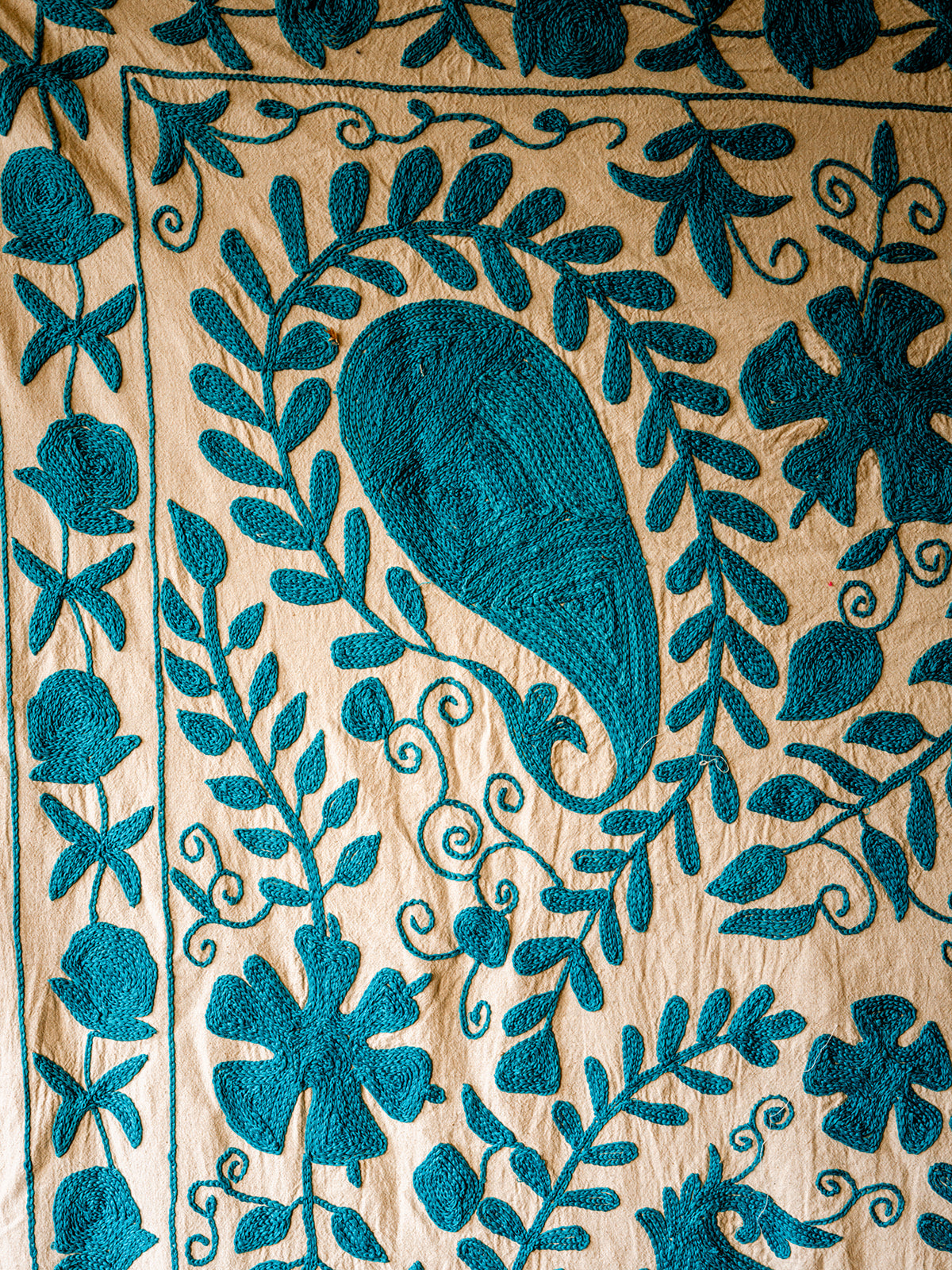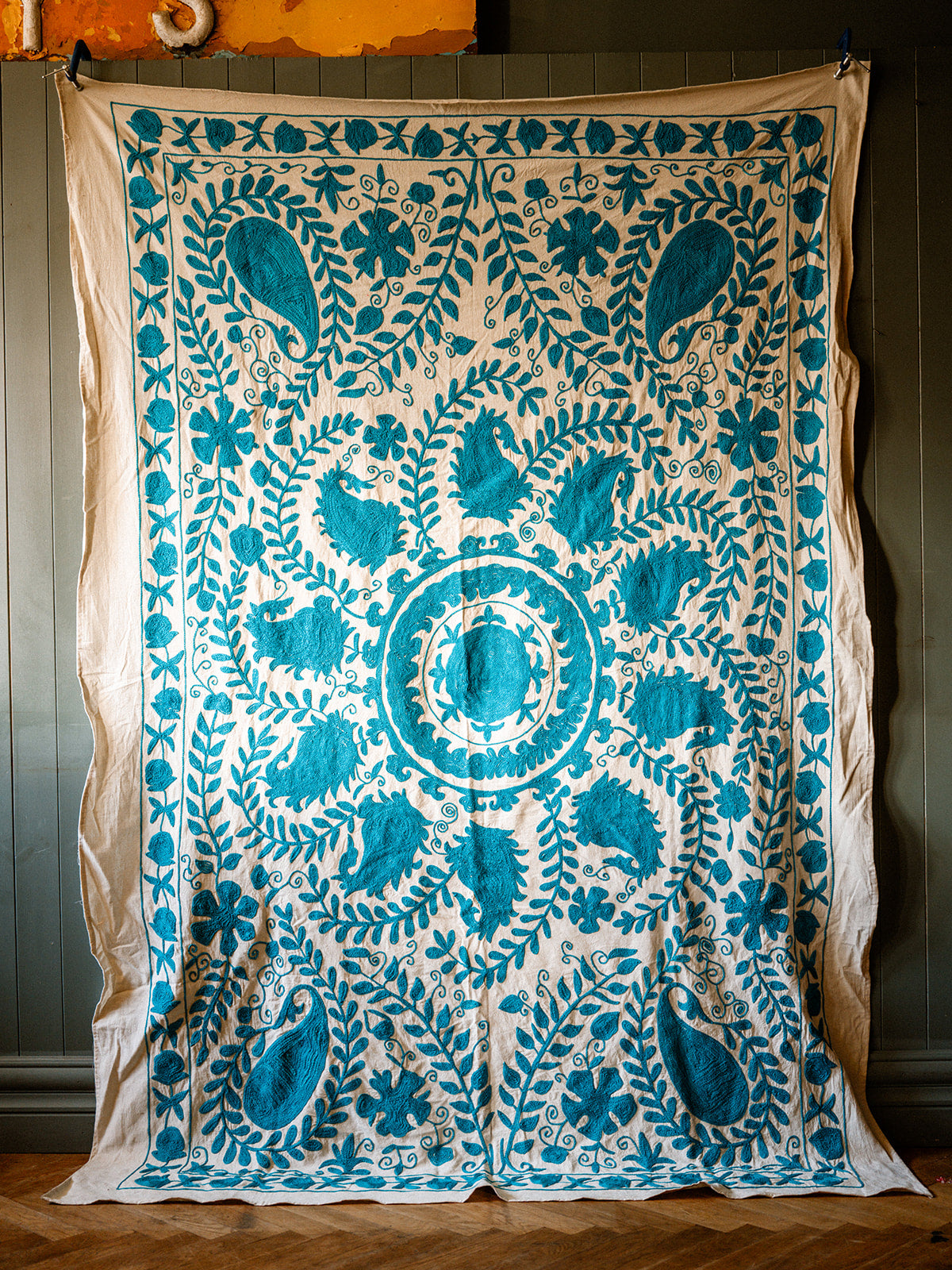 Suzani textiles are known for their unique patterns and vibrant colours. This particular throw showcases a beautiful array of floral motifs, making it not only functional but also a true work of art. With its generous size, it's ideal for cozy evenings or as a stylish statement piece in any room.
