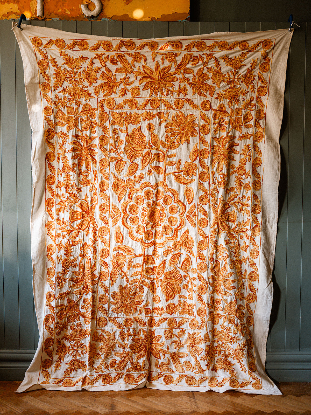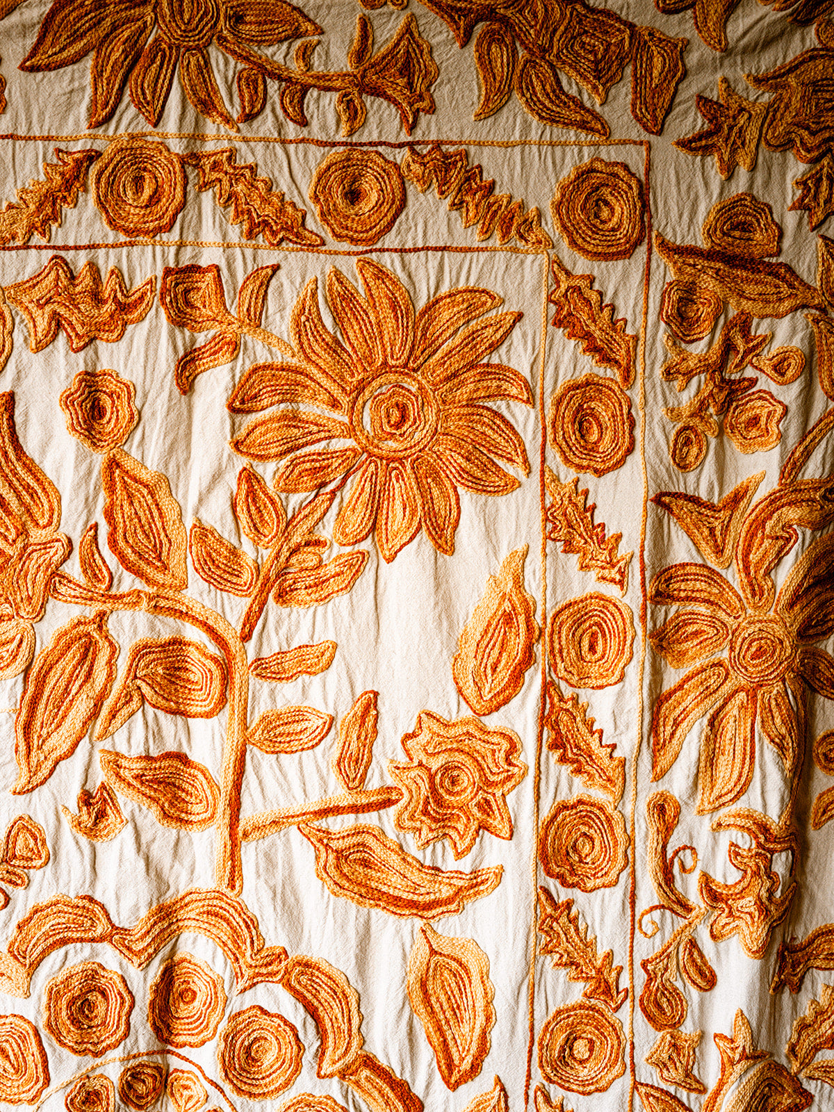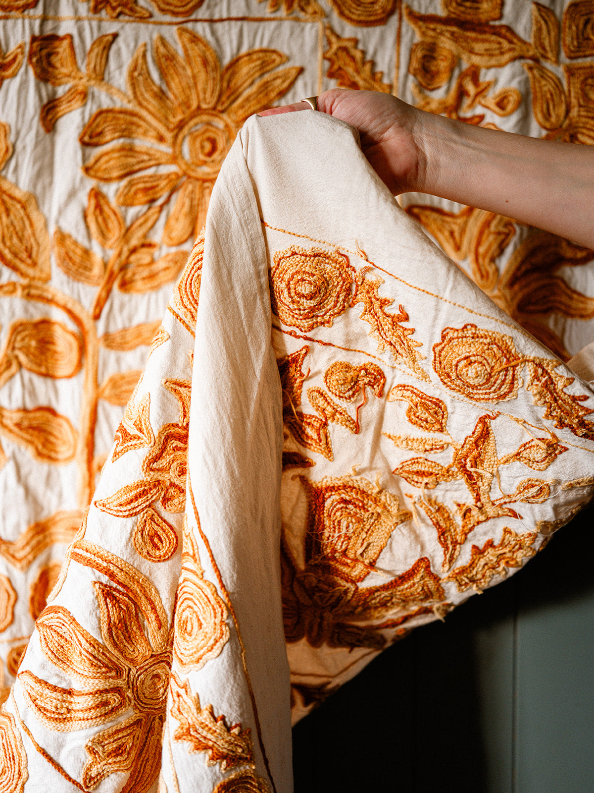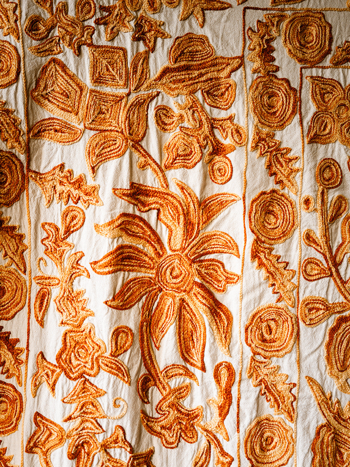 Suzani textiles are known for their unique patterns and vibrant colours. This particular throw showcases a beautiful array of floral motifs, making it not only functional but also a true work of art. With its generous size, it's ideal for cozy evenings or as a stylish statement piece in any room.