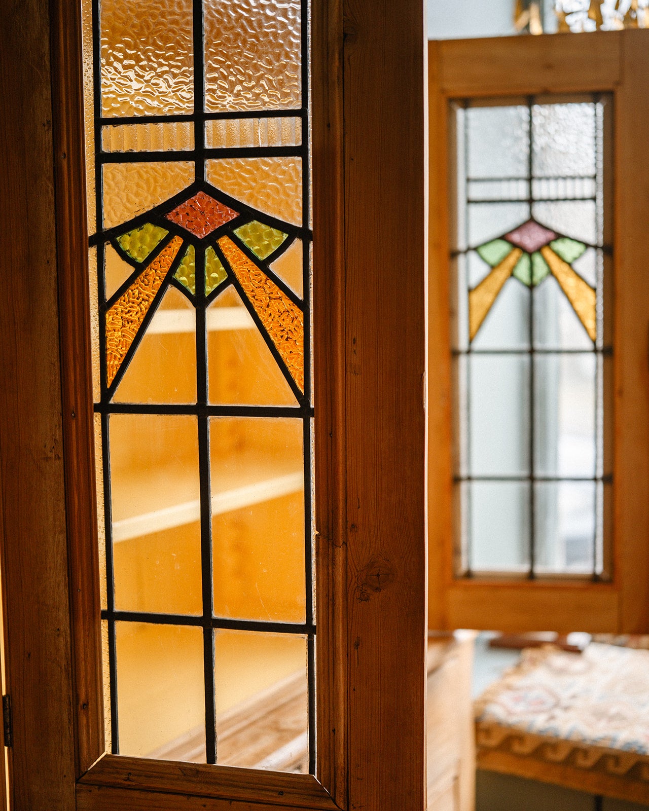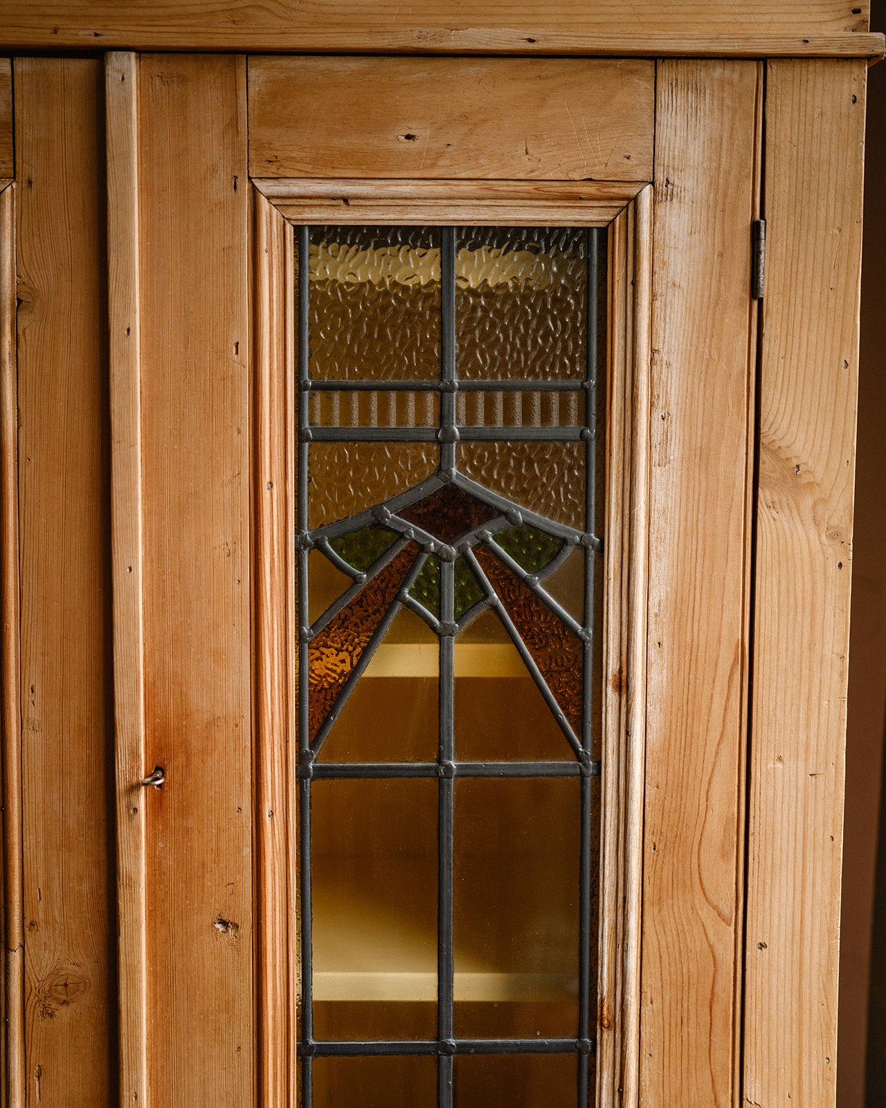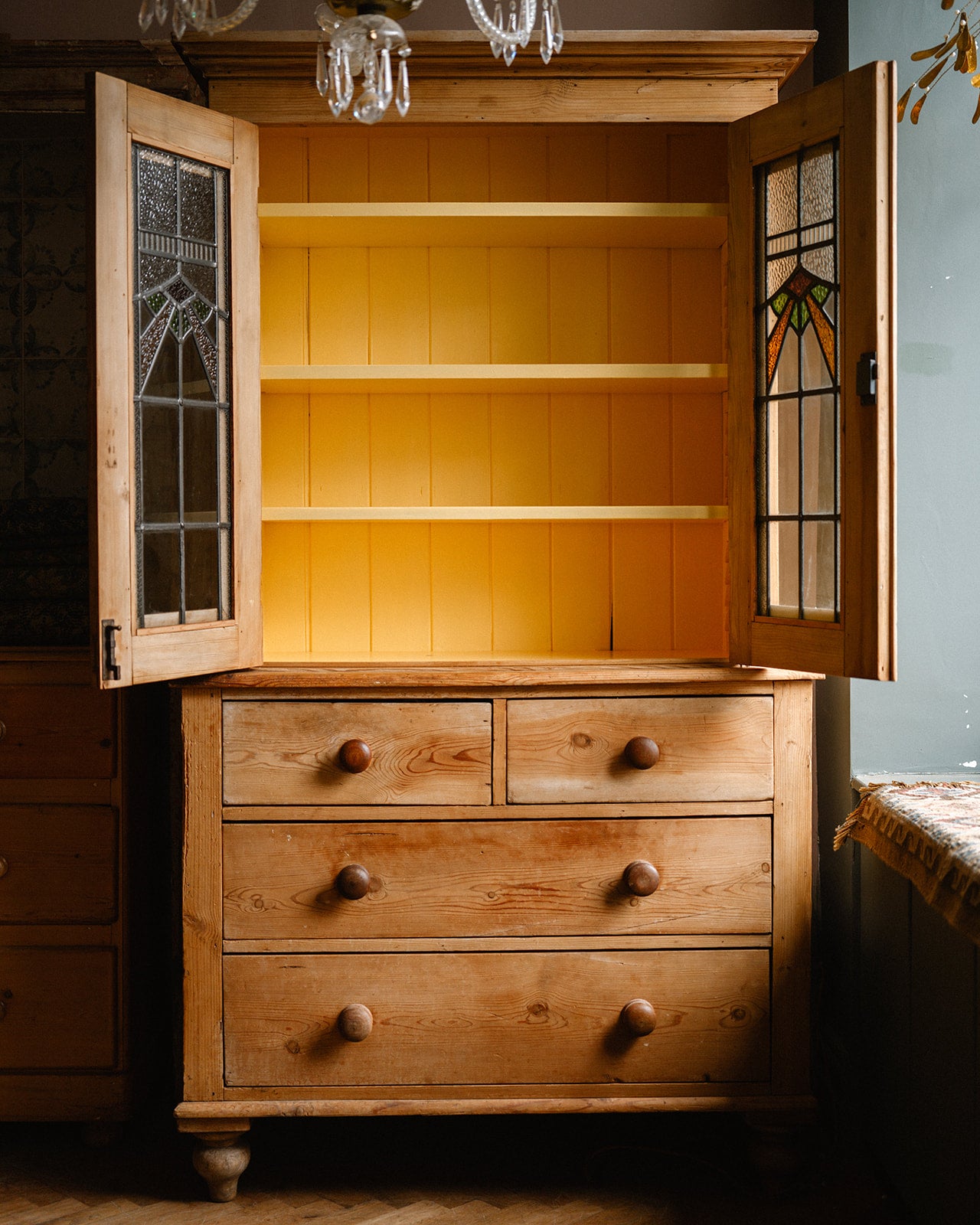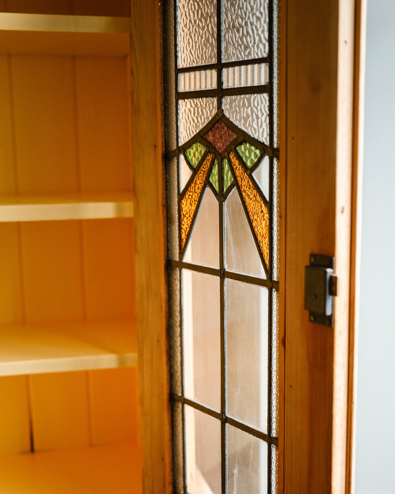 This antique pine dresser features beautiful stained glass windows and a charming buttery yellow interior paint.