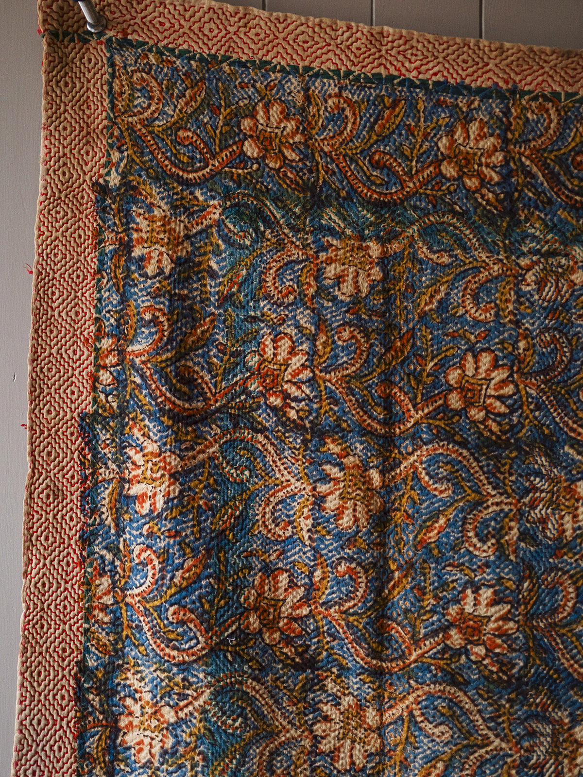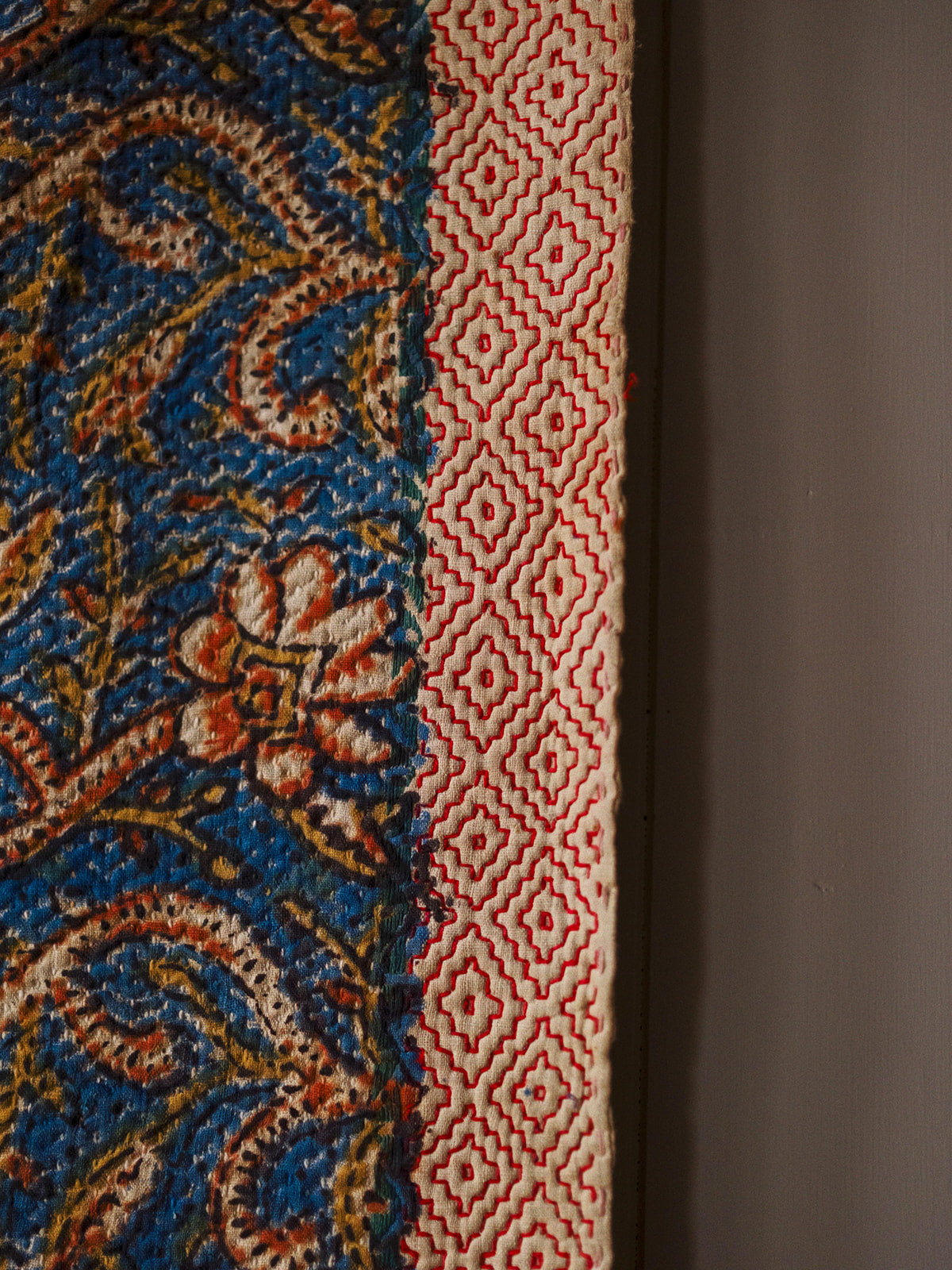 Add a touch of timeless elegance to your home with our vintage Bagru Kantha quilts, handmade in India. These stunning quilts are crafted from layers of recycled cotton saris, featuring intricate kantha embroidery and traditional Bagru block prints. Each quilt is reversible, offering two unique looks in one, with vibrant patterns on one side and subtle designs or plain textures on the other.