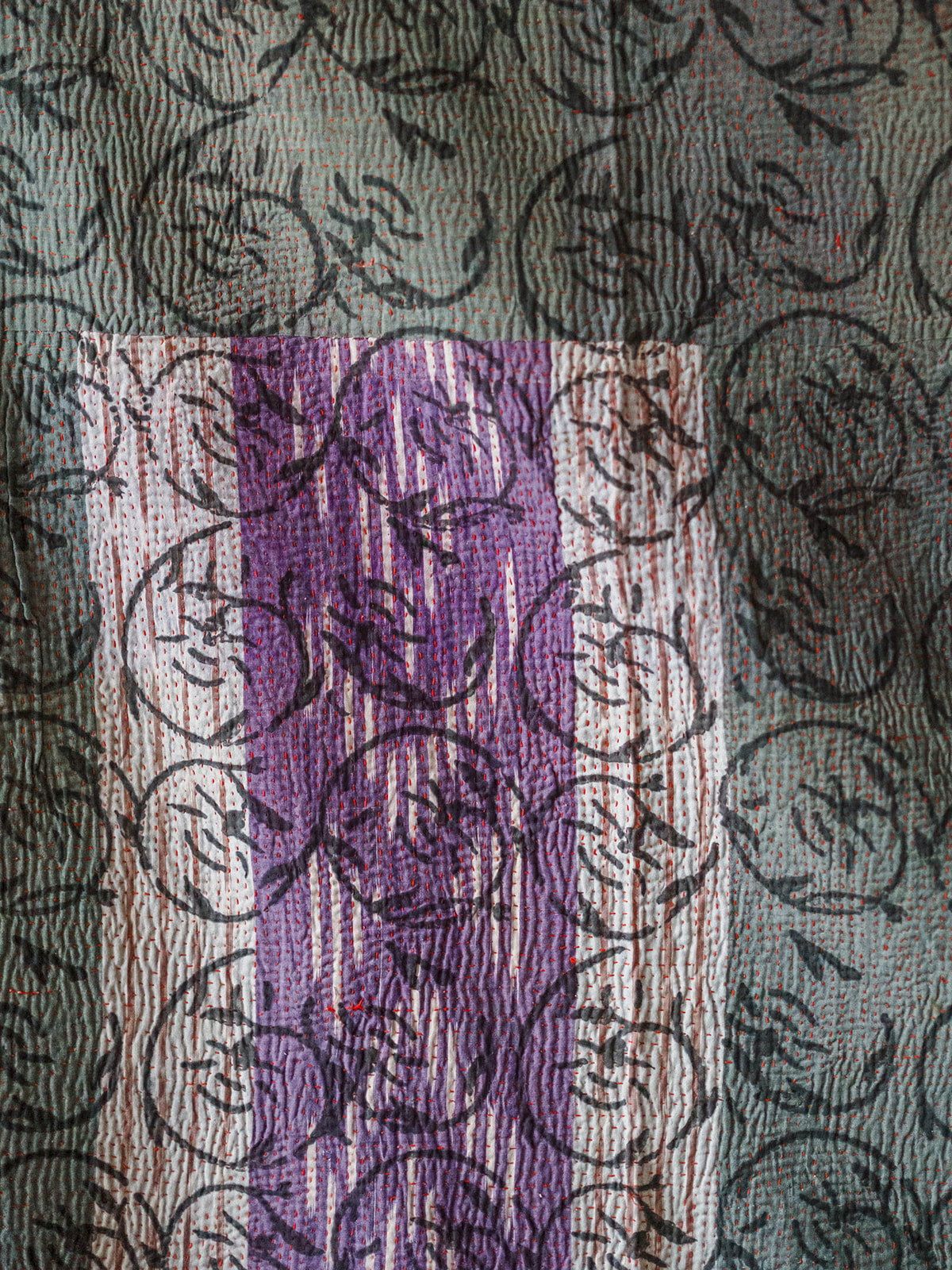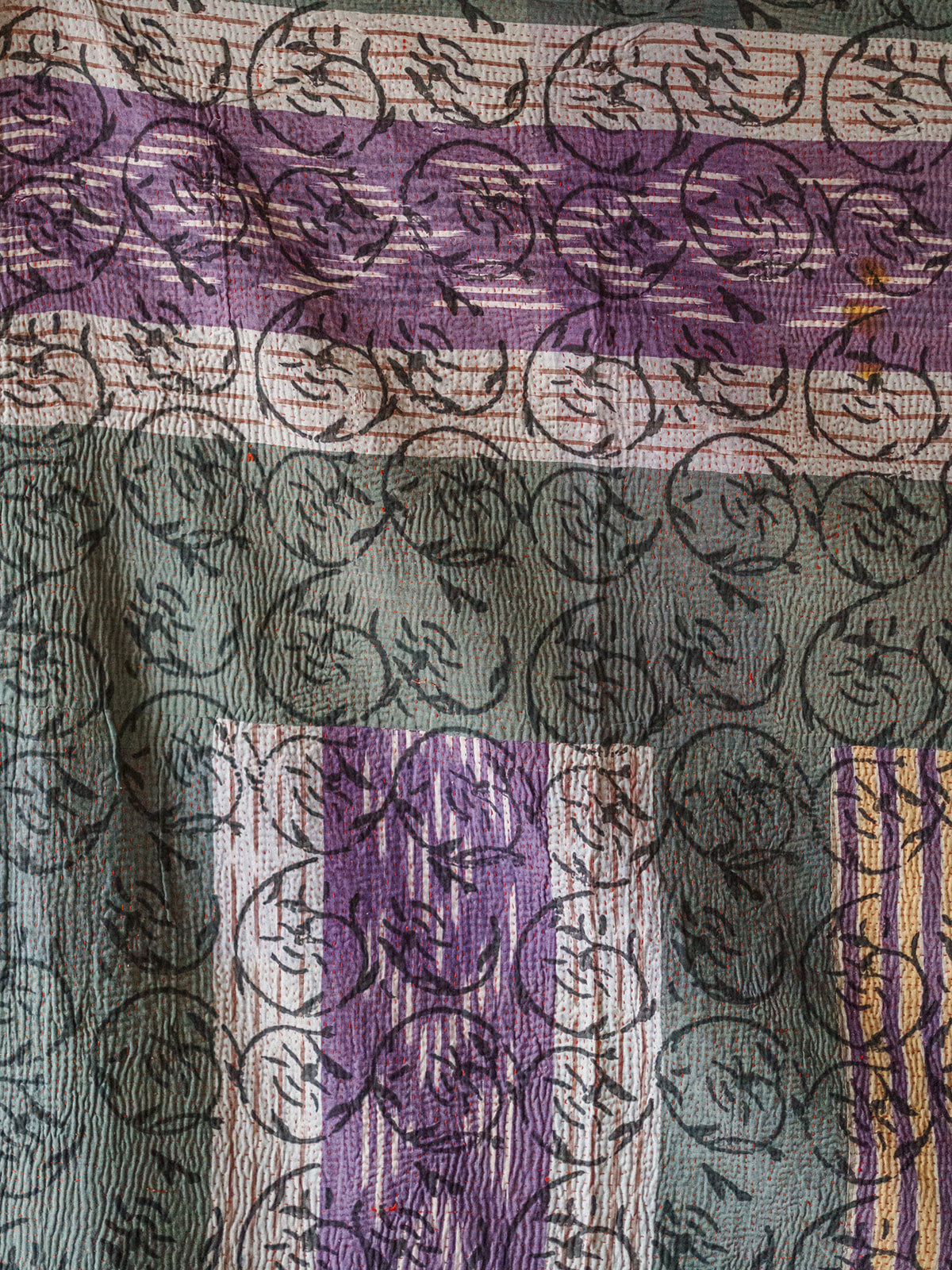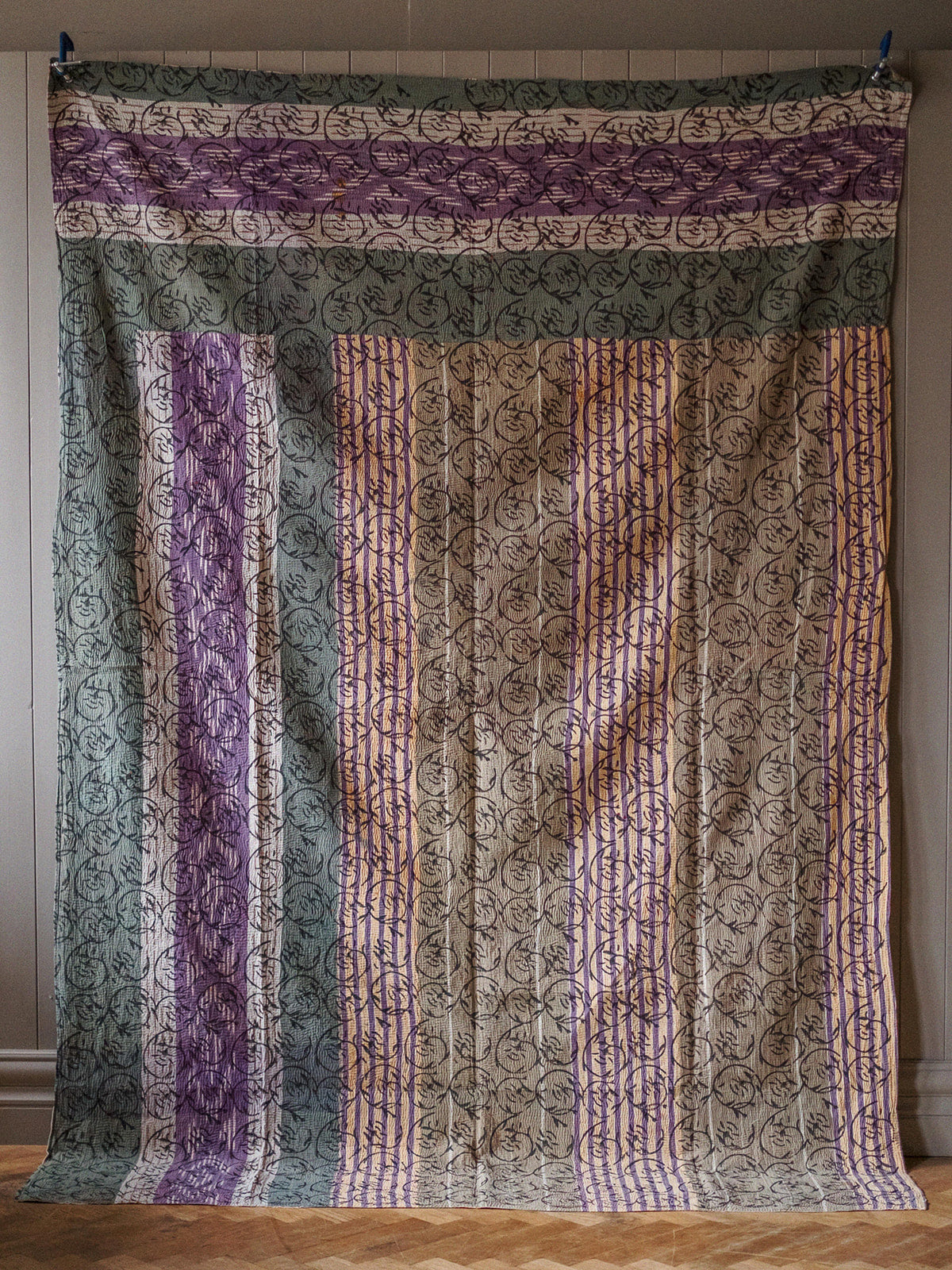 This vintage Indian hand-printed block throw is a beautiful piece of traditional craftsmanship, handmade in India using age-old block printing techniques. Each motif is stamped by hand with carved wooden blocks, creating unique patterns that carry the charm of true artisan work. Finished with delicate running stitch detailing, the fabric has a soft, textured feel that adds warmth and character. Made from natural cotton, it is light yet durable, making it easy to use in many ways — drape it across your sofa or bed as a throw, hang it as a curtain, or style it as an eye-catching table cloth. Its gentle vintage tones and handmade finish bring a touch of soulful heritage to any space.