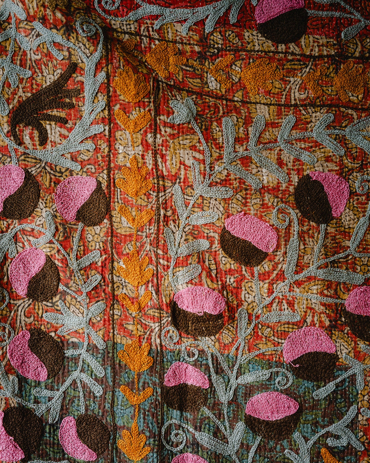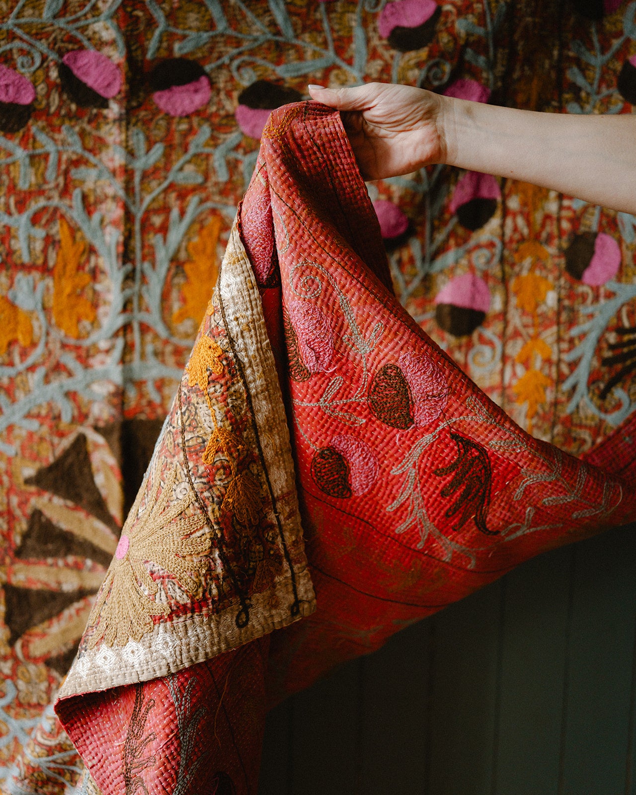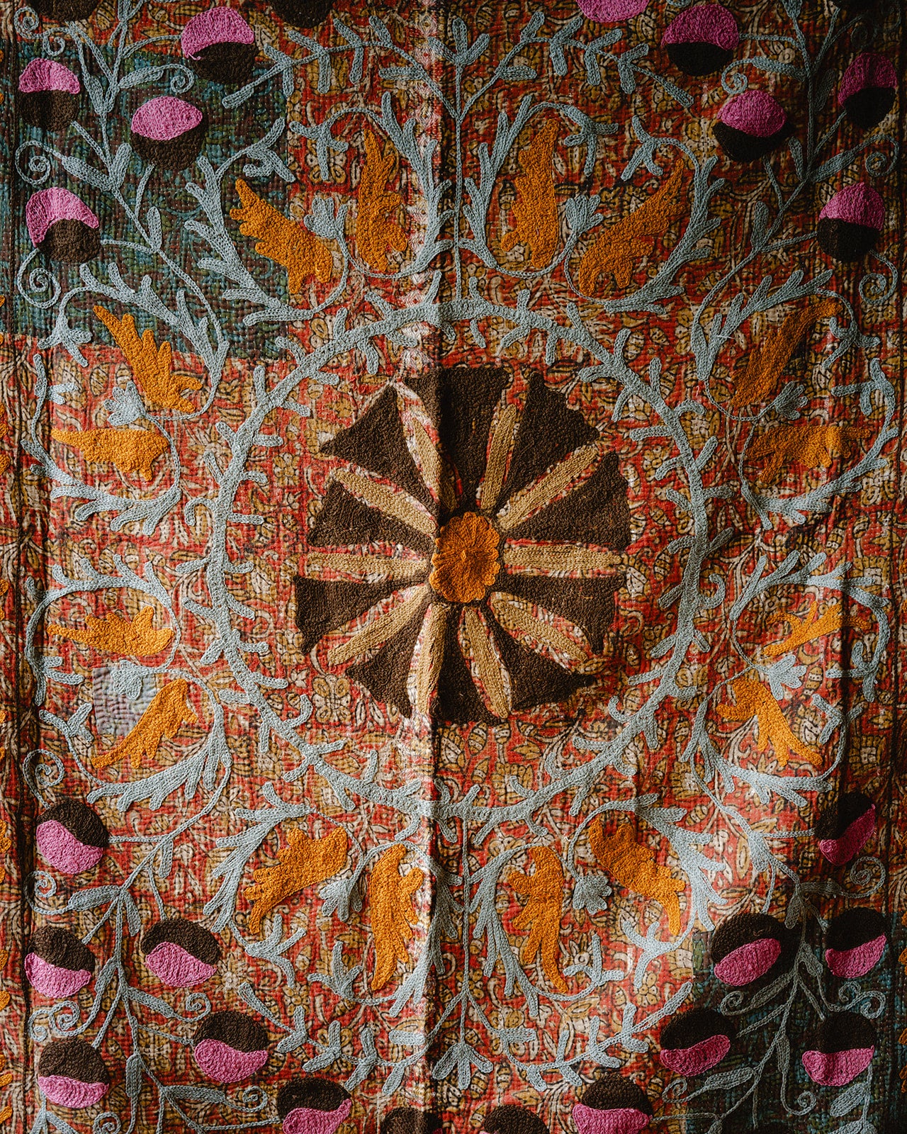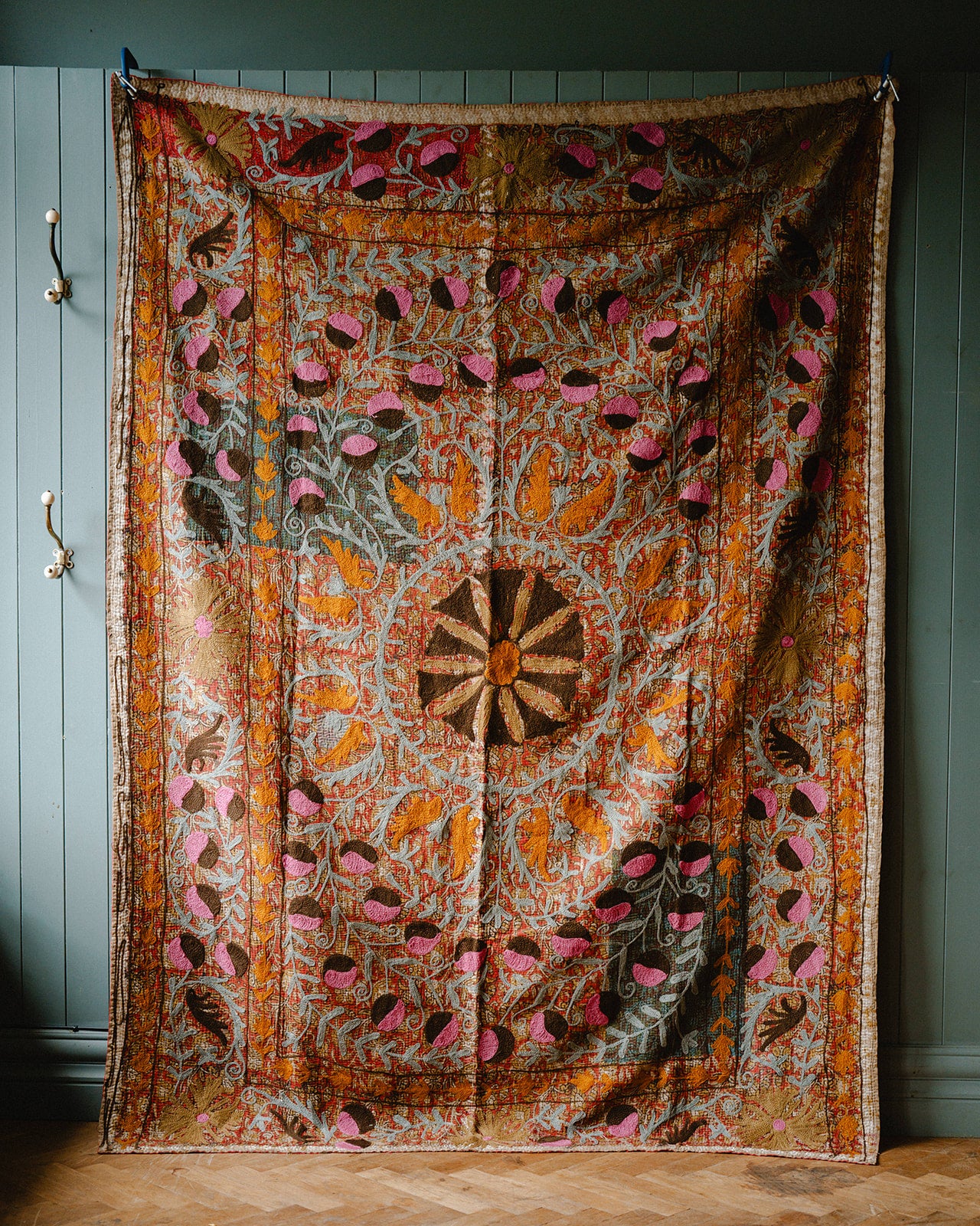 Suzani textiles are known for their unique patterns and vibrant colours. This particular throw showcases a beautiful array of floral motifs, making it not only functional but also a true work of art. With its generous size, it's ideal for cozy evenings or as a stylish statement piece in any room.